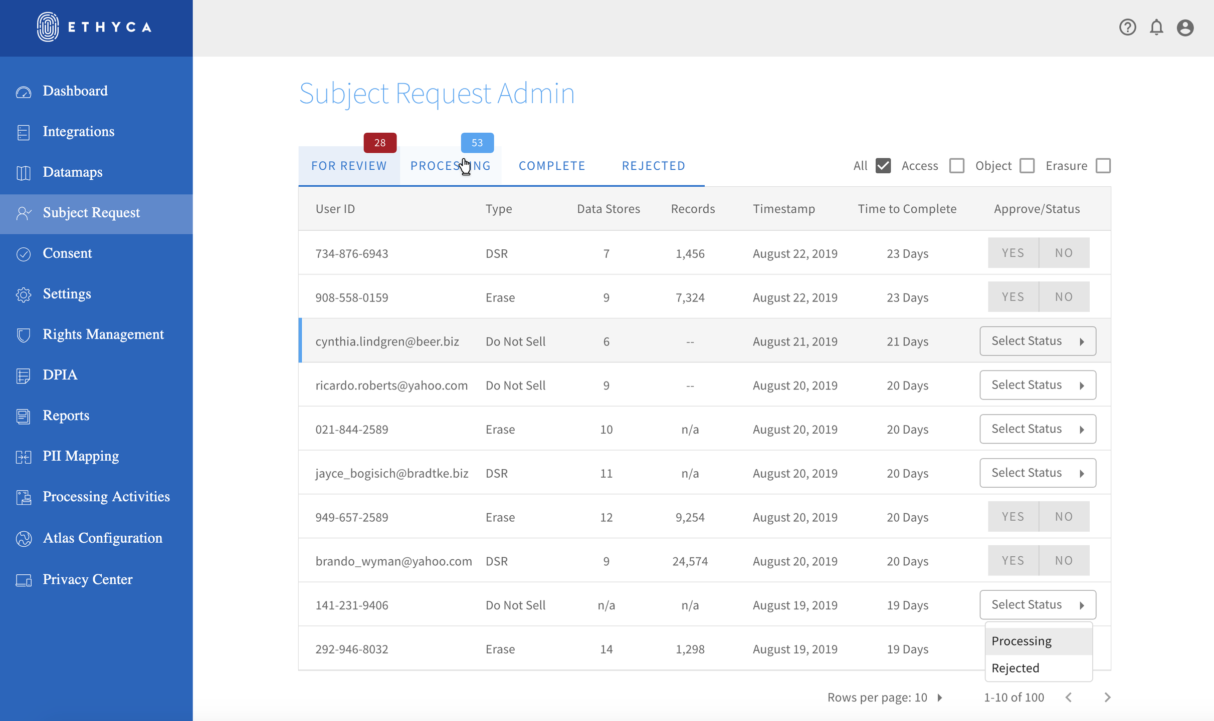 Let Ethyca take care of your CCPA and GDPR obligations, allowing your team to focus on more critical tasks while gaining a comprehensive insight into your organization's data supply chain. With Ethyca, you can effortlessly handle Subject Access, Edit, and Erasure Requests, or opt for a fully automated experience that requires no input from your team. The platform streamlines the retrieval of categorized user data based on processing activities upon request, and it enables individuals to easily select and amend their data with Ethyca’s functionality to access specific attributes. By delegating all "do not sell my data" requests to Ethyca, you can simplify your CCPA compliance efforts significantly. Rather than spending your days managing user consent preferences manually, you can depend on Ethyca to take care of it. This platform seamlessly links cookie consent with the processing activities associated with each user's personal data record. Furthermore, Ethyca boasts a customizable and user-friendly interface, empowering users to effortlessly manage their consent preferences, ensuring a smooth and engaging experience. Ultimately, this not only fosters user trust but also promotes compliance without overloading your team with additional responsibilities. In doing so, you create a more efficient environment that benefits both your organization and its users.