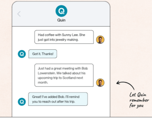 Quin functions as a digital assistant designed to enhance and maintain valuable relationships in both work and personal settings. It achieves this by compiling pertinent details about your contacts and providing customized suggestions for gestures, conversation starters, articles, and gifts that can enrich your interactions. Users can easily input information about their contacts via text, email, or directly through the app, allowing Quin to generate thoughtful outreach ideas and timely reminders for follow-ups. This feature empowers users to nurture relationships on a large scale without sacrificing quality, making it especially beneficial for busy professionals who manage numerous connections. Quin identifies the most relevant topics, articles, and gifts to help ensure that users create memorable impressions. When the moment arises to reach out, Quin is ready to compose a message for you to send. Whether you're focusing on one relationship or several thousand, Quin streamlines the process of maintaining strong bonds effortlessly. Simply share essential information about the individuals you value through text, email, or the app itself, and watch as Quin assists you in building deeper connections. Ultimately, Quin transforms the way you engage with others, making relationship management both efficient and meaningful.