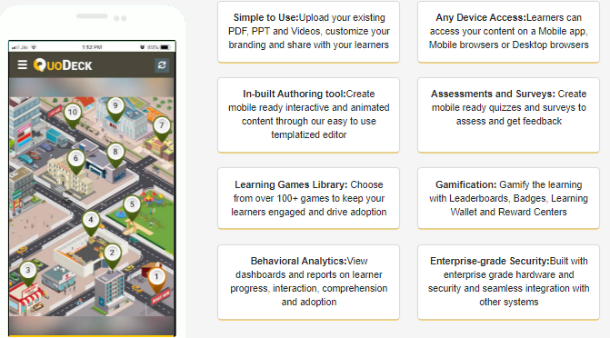 QuoDeck is a robust platform that enables you to design and implement mobile game-based learning experiences aimed at training, evaluating, and managing your workforce, all while being user-friendly. It allows you to craft engaging experiences that captivate learners, not out of obligation but because they genuinely desire to participate. Your educational materials can be delivered to learners on their preferred devices, in their chosen formats, and containing the precise information they require. You have the capability to upload various content types such as PDFs, PPTs, and videos, while also personalizing your branding to match your organization’s identity. Once prepared, you can easily share this content with your learners, who can access it through a mobile app, desktop browsers, or mobile browsers. Our intuitive, template-driven editor empowers you to produce animated and interactive content that is optimized for mobile viewing. Additionally, you can track and analyze learner engagement, understanding, and adoption through comprehensive dashboards and reports. Designed with enterprise-grade technology, QuoDeck ensures top-notch security and seamless integration with existing systems, making it a complete solution for modern learning needs.