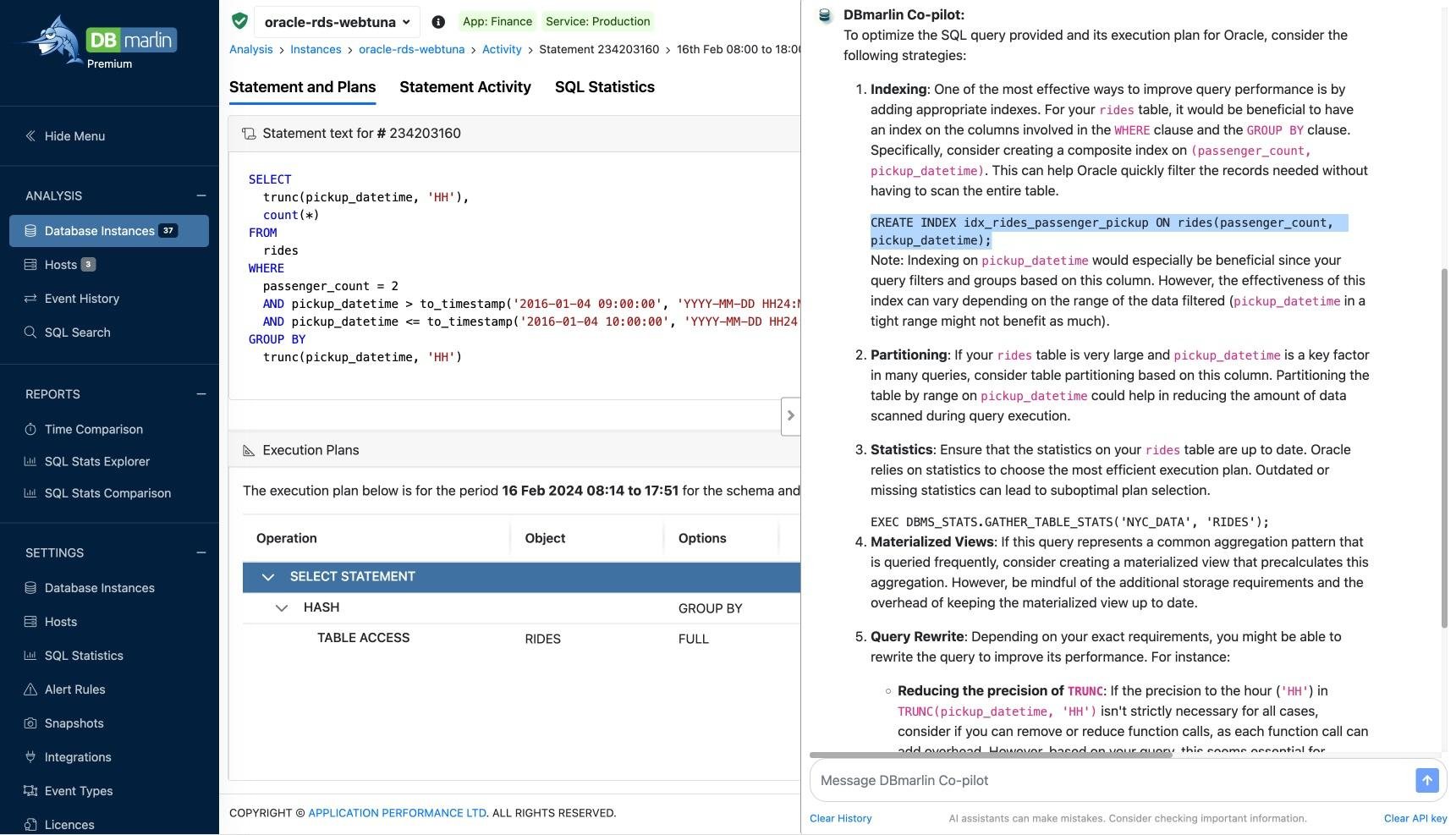 DBmarlin offers an AI assistant referred to as the DBmarlin AI Co-pilot, which users can easily access from any screen with a single click, unveiling a slide-out panel for inquiries. In addition, throughout the interface, there are "Send to DBmarlin Co-pilot" buttons that allow users to obtain customized suggestions on various subjects, such as managing and improving wait events, along with optimizing SQL statements by providing guidance on indexes, query rewrites, partitioning strategies, materialized views, and adjustments to database parameters. This AI assistant is specifically designed to generate automatic recommendations aimed at enhancing both the performance of databases and the execution of SQL statements. The slide-out panel's convenience ensures that users can quickly reach the DBmarlin AI Co-pilot from any area of the application. By simply clicking, users can submit their SQL Text and Execution Plan, which results in a comprehensive list of suggestions, including the formulation of indexes and other optimization strategies, all delivered within a rapid timeframe of merely 30 seconds. The speed and effectiveness of this functionality significantly elevate the user experience, providing immediate insights and recommendations that lead to improved database operations. Furthermore, this innovative feature underscores DBmarlin's commitment to enhancing user efficiency and streamlining database administration processes.