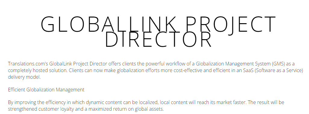 For almost thirty years, GlobalLink, our translation management system, has been instrumental in assisting leading global organizations in streamlining the creation, management, and deployment of content for international audiences. We have consistently evolved our technology to align with the shifting demands of our clients' businesses. Today, GlobalLink users experience an impressive return on investment of over 90% within just a year. Furthermore, the typical client enjoys savings exceeding 50% in terms of costs, time, and translation management efforts. By centralizing the localization process, GlobalLink significantly reduces the resources needed for translation. This platform provides the automation and efficiency necessary to address both current and future business challenges. By choosing GlobalLink, you can enhance your presence in the international market. Trust GlobalLink as your go-to solution for translation management needs.