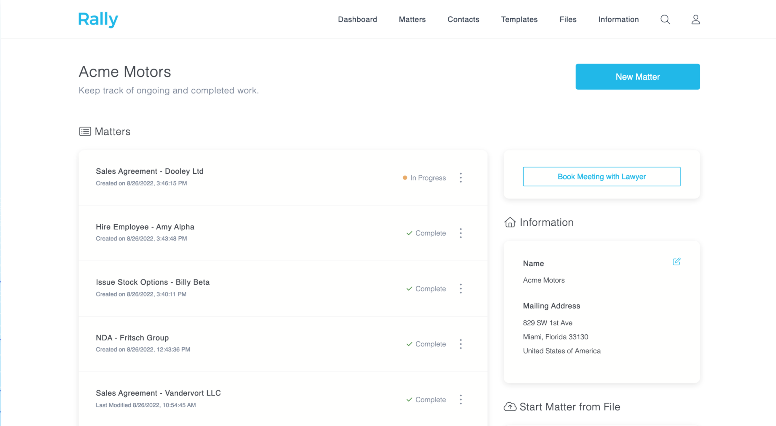 Rally is a groundbreaking legal solution tailored for enterprises and their legal teams, enhancing the overall experience of engaging with legal matters. By automating various tasks, it promotes effortless collaboration, document signing, and organization, harnessing advanced document automation and CRM integrations to create sales agreements and other legal documents with exceptional efficiency. Users can easily send documents for eSignatures, facilitating a smooth workflow throughout the process. The platform boasts an automatically refreshed data room that aids in keeping everything organized, effectively removing the disarray often associated with due diligence efforts involving potential investors or buyers. With its robust global search capability, you can find any document or piece of information in mere moments, which drastically cuts down on email exchanges and improves the management of document versions. This secure, unified source of truth fosters efficient information sharing among team members, enhancing teamwork and collaboration. Additionally, our devoted Customer Success team, comprehensive network of law firms, and vibrant Slack community ensure that you have the necessary support, enriching your overall experience. The intuitive interface and handy shortcuts make legal tasks feel more approachable and enjoyable. Ultimately, Rally revolutionizes how businesses tackle legal responsibilities, streamlining processes and alleviating stress, while paving the way for a future where legal work is not just manageable, but truly satisfying.