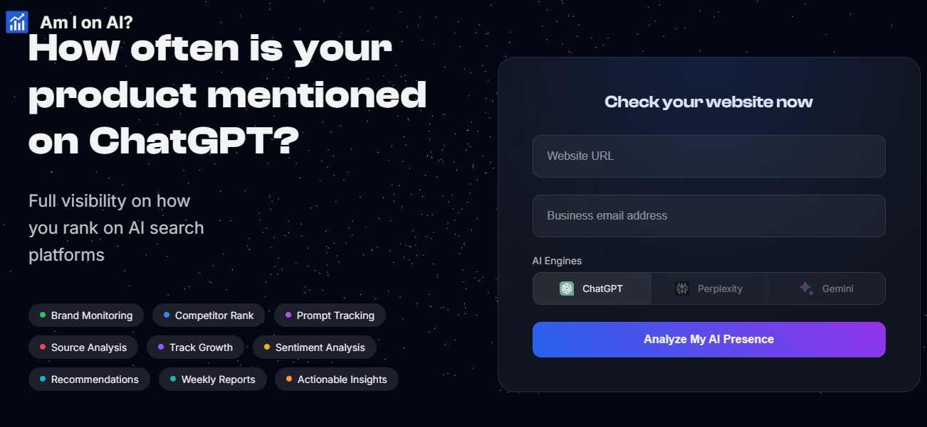 "Am I on AI?" is an all-encompassing resource for companies, providing them with a thorough understanding of their performance across AI search platforms such as ChatGPT, Perplexity, and Gemini. The tool is enriched with a variety of features, including brand monitoring, competitor analysis, prompt tracking, source evaluation, growth metrics, sentiment assessment, personalized suggestions, weekly updates, and actionable insights. By analyzing queries related to your brand, it enables you to determine which questions lead to your brand being suggested, allowing you to identify trends and explore new strategies to bolster your brand's visibility in AI discussions. In addition, it highlights the specific websites and domains that enhance your AI presence, directing your attention to the most impactful platforms while revealing new opportunities for exposure. With its continuous tracking of your brand's visibility growth, the platform provides a transparent view of how your representation in AI interactions evolves over time, facilitating businesses in adjusting their strategies as needed. This ongoing evaluation not only keeps brands informed but also equips them to navigate the dynamic realm of AI-driven dialogues effectively, ensuring they remain competitive and relevant. Ultimately, "Am I on AI?" serves as a vital instrument for brands aiming to thrive in an increasingly AI-focused market.