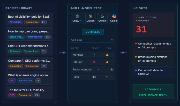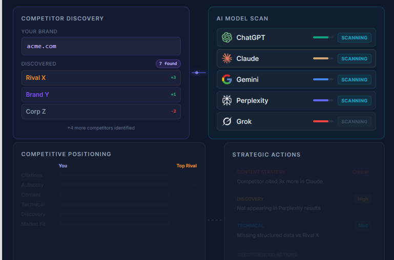 Akii acts as a sophisticated platform for enhancing AI search intelligence and visibility, designed to help companies understand and improve how their brand is represented across various AI systems, such as ChatGPT, Gemini, Claude, Perplexity, and Microsoft Copilot. By offering continuous monitoring of how these AI tools view, rank, and advocate for a brand, Akii provides prompt insights regarding visibility, authority, and overall reputation in AI-generated content. Its array of features includes AI visibility tracking, brand evaluations, competitor analysis, and website optimization, equipping teams to identify potential gaps, risks, and opportunities that could affect content discoverability and citation. Rather than depending solely on traditional search rankings, Akii examines real-time outputs from AI, revealing which competitors are favored, the rationale behind their prominence, and the shifting dynamics of positioning over time. Additionally, it delivers prioritized, impact-oriented recommendations that aid teams in boosting their brand’s visibility and refining their content strategies, ultimately helping them maintain a competitive edge in the market. The platform's comprehensive approach ensures that businesses are well-equipped to navigate the complexities of AI-driven branding and content visibility.