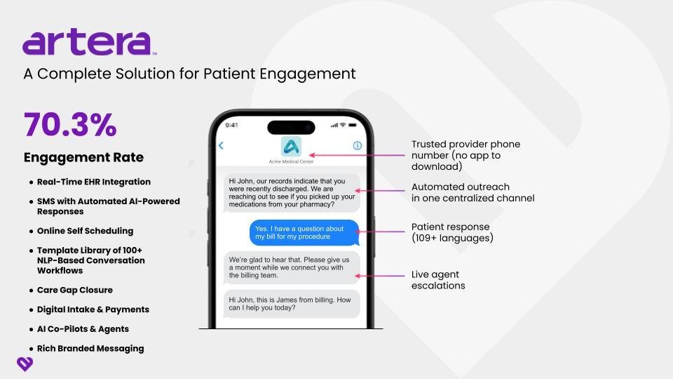 Artera, a leader in SaaS for digital health, revolutionizes the patient experience with AI-powered virtual agents (available in both voice and text) that enhance every stage of the patient journey. Trusted by over 900 provider organizations—including specialty groups, FQHCs, major IDNs, and federal agencies—Artera engages with 100 million patients each year. Designed to support front desk teams, these virtual agents streamline patient access tasks such as self-scheduling, intake, forms, billing, and more. Whether complementing your staff or enabling a fully autonomous digital workforce, Artera provides customizable virtual agent solutions tailored to meet healthcare organizations at any stage of their AI adoption. Facilitating 2 billion communications in 109 languages across voice, text, and web, Artera combines a decade of healthcare expertise with the power of AI to drive better outcomes.