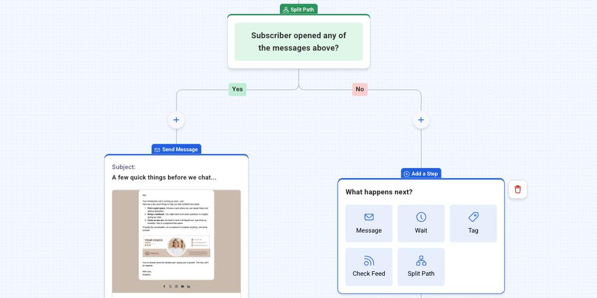 - Behavioral triggers based on tags, opens, clicks, or purchases