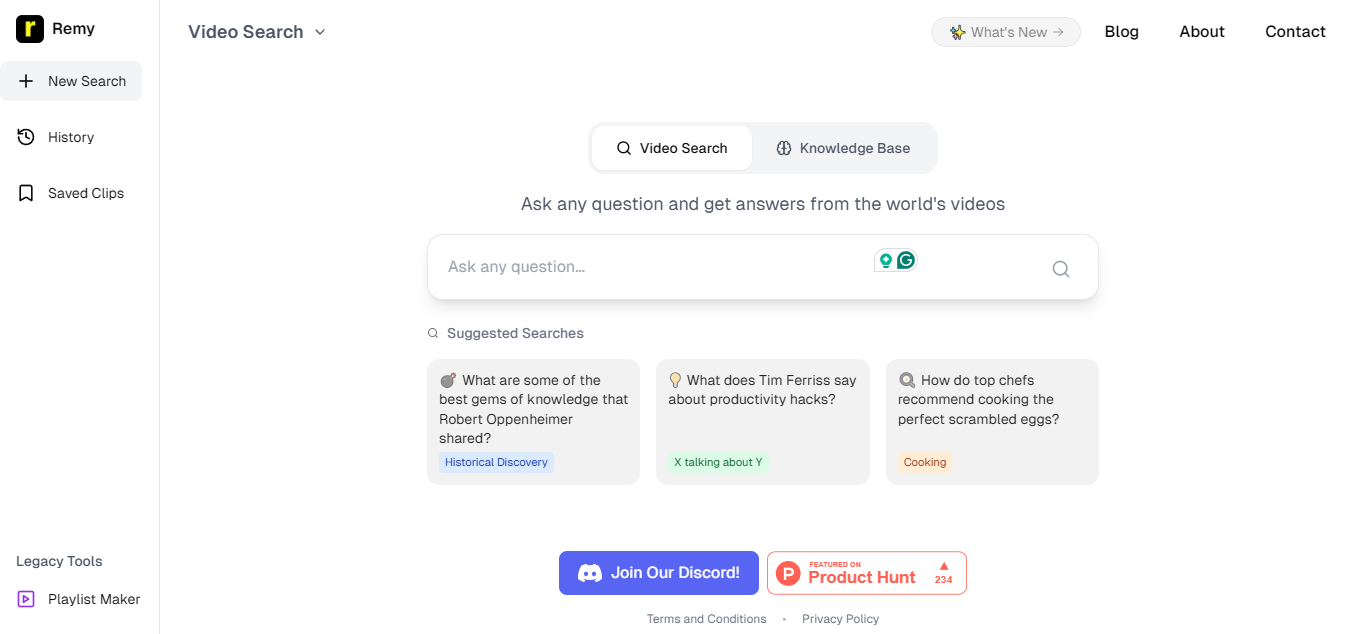 Remy is a cutting-edge video answer platform that harnesses the power of AI to identify precise moments in videos that address user questions. Rather than just browsing through video titles and descriptions, Remy fully analyzes video content to deliver accurate answers derived from trustworthy online sources. You can ask questions in natural language, and within approximately 15 seconds, Remy will search billions of videos to find the most relevant answers. This platform enables you to directly navigate to the segments of videos that provide the information you need, while also encouraging follow-up inquiries for further clarification. Additionally, Remy boasts an advanced knowledge base that empowers users to curate a personalized library of reliable content sources, whether by subscribing to preferred YouTube channels, creating a playlist of educational videos, or researching specific topics. By exclusively searching within your selected sources, Remy guarantees that it delivers the most pertinent results, establishing itself as an invaluable resource for learning and exploration. Ultimately, this innovative functionality revolutionizes the way users engage with video content, promoting a more streamlined approach to information acquisition while enhancing the overall learning experience. With Remy, users can delve deeper into subjects of interest, making video learning not only more efficient but also more enjoyable.