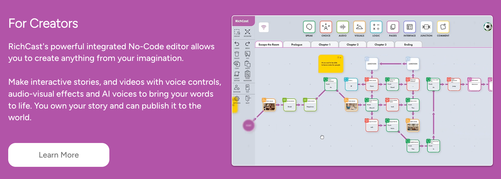 RichCast provides a powerful No-Code editor that allows you to bring your imaginative concepts to life effortlessly. With this tool, you can design captivating stories and videos that incorporate voice commands, rich audio-visual effects, and AI-generated voices, facilitating a vibrant expression of your creativity. You retain complete ownership of your narratives, granting you the freedom to share them with a global audience. Additionally, all features of RichCast's player are designed to work seamlessly across multiple platforms, such as Windows, Mac, iOS, and Android. This flexibility empowers creators to take full advantage of the comprehensive interface available on their tablets, laptops, or desktops, enhancing their projects significantly. Your creativity can truly flourish with RichCast, as it eliminates barriers to storytelling like never before, encouraging everyone to explore their narrative potential.