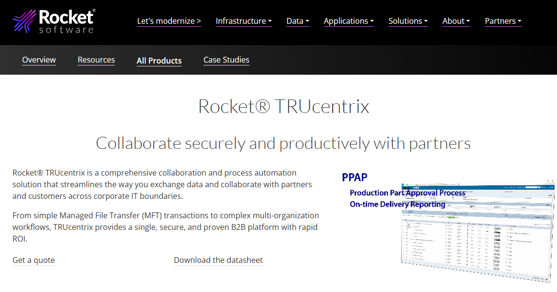 Rocket TRUcentrix functions as a holistic solution designed for collaboration and process automation, significantly improving the effectiveness of data sharing and teamwork with both partners and customers across various corporate IT ecosystems. Whether engaging in simple Managed File Transfer (MFT) operations or tackling complex workflows that involve numerous organizations, TRUcentrix provides a cohesive, secure, and dependable B2B platform that ensures rapid returns on investment. In the current complex landscape of manufacturing, marked by strategic alliances and global supply chains, multi-enterprise project teams demand prompt access to a secure digital environment that facilitates collaboration, enables real-time tracking, and promotes effective resolution of issues. Utilizing Rocket TRUcentrix allows you to collaborate seamlessly with your partners while building robust workflows and automation processes that meet essential compliance standards including ISO, ITAR, and APQP. You retain complete control over the information you decide to share with your worldwide partners and suppliers, which aids in the effective management of shared data in a secure and efficient online setting. Furthermore, this platform also equips organizations with the agility to respond quickly to shifting market conditions while enhancing their overall operational effectiveness. By leveraging Rocket TRUcentrix, businesses can ensure their collaborations are not only productive but also strategically aligned with industry standards.