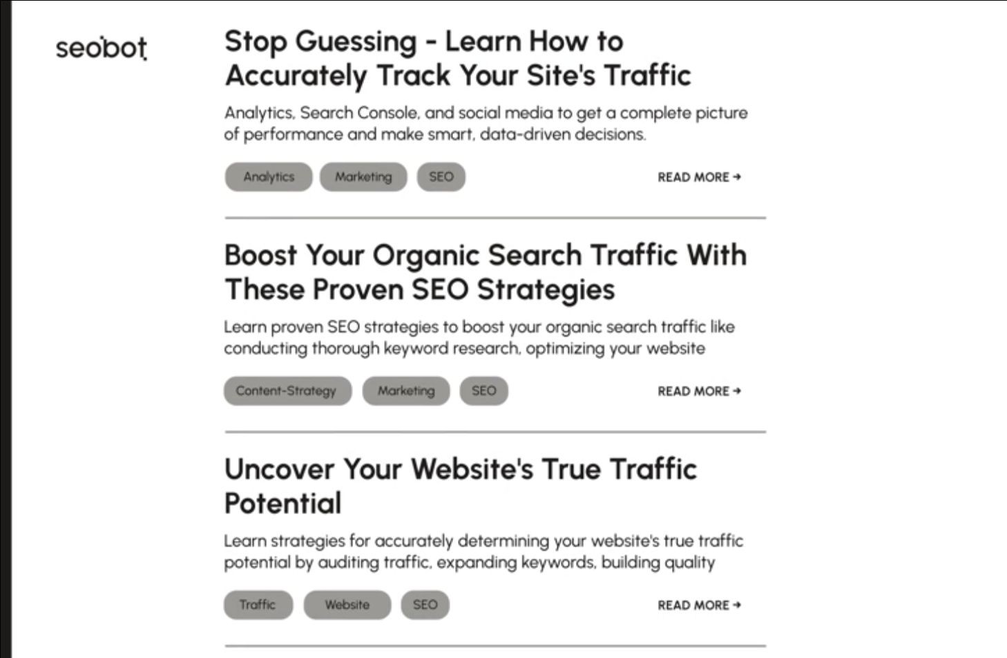 SEObot, commonly referred to as the SEO robot, expertly analyzes Google keywords to identify the most effective ones for boosting visibility. Besides enhancing current articles through traffic insights, SEObot has the ability to create new content that ranks well in search engine results pages. This functionality enables users to focus on vital tasks while SEObot effectively directs organic traffic from Google. It serves as an ideal resource for busy creators who desire effective results with minimal input. Over time, the tool consistently enhances its performance quality. Additionally, it utilizes AI to assess the effectiveness of all published articles, removing those that perform poorly while elevating the success of high-performing content. Users can either collaborate by providing input or take direct control as needed, but the system primarily operates in a seamless autopilot mode, which guarantees reliable outcomes. Consequently, individuals can devote more attention to their primary projects without getting overwhelmed by the intricacies of SEO, leading to greater productivity and efficiency in their work. Ultimately, SEObot empowers users to achieve their goals while simplifying the often daunting process of managing online visibility.