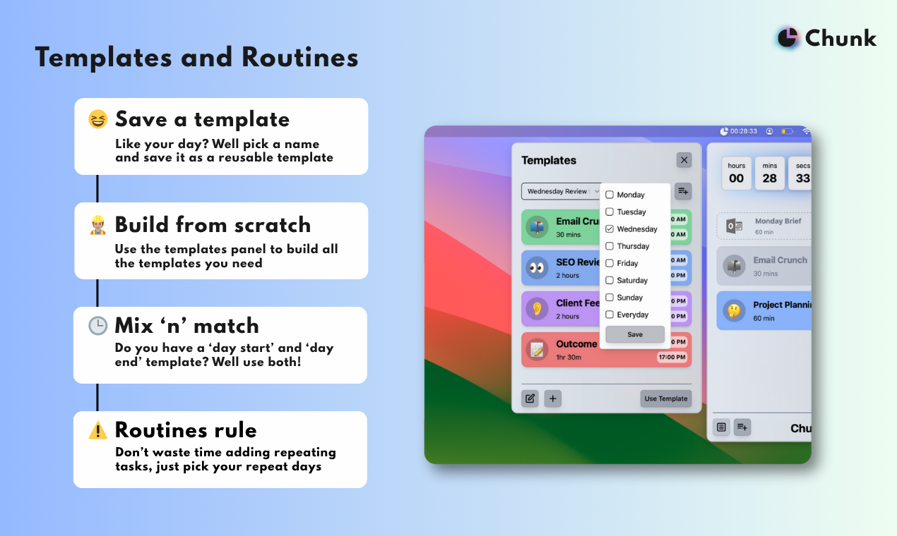 Chunk is a comprehensive time-blocking command center built exclusively for macOS, designed to help users plan their days with precision and sustain deep focus throughout long work or study sessions. The app offers fullscreen task reminders that cut through distractions and keep you firmly on schedule. Seamless calendar integration with Apple, Google, and Outlook ensures that your tasks and appointments stay synchronized across all your devices and workflows. Users can create reusable routines and templates to automate repetitive planning tasks, saving time and increasing consistency. Adding quick tasks is effortless, requiring just a single click, so you never lose momentum. One of Chunk’s standout features is the ability to shift your entire day forward or backward, making it easy to adapt when your schedule changes unexpectedly. Designed with people who need structure but dislike friction, Chunk is perfect for professionals, students, freelancers, and individuals with ADHD. The app’s intuitive interface encourages daily use and helps users build productive habits. By combining powerful scheduling tools with flexible time management, Chunk supports users in staying organized and in the zone. Overall, it’s a versatile solution for anyone looking to take control of their time and maximize productivity on macOS.