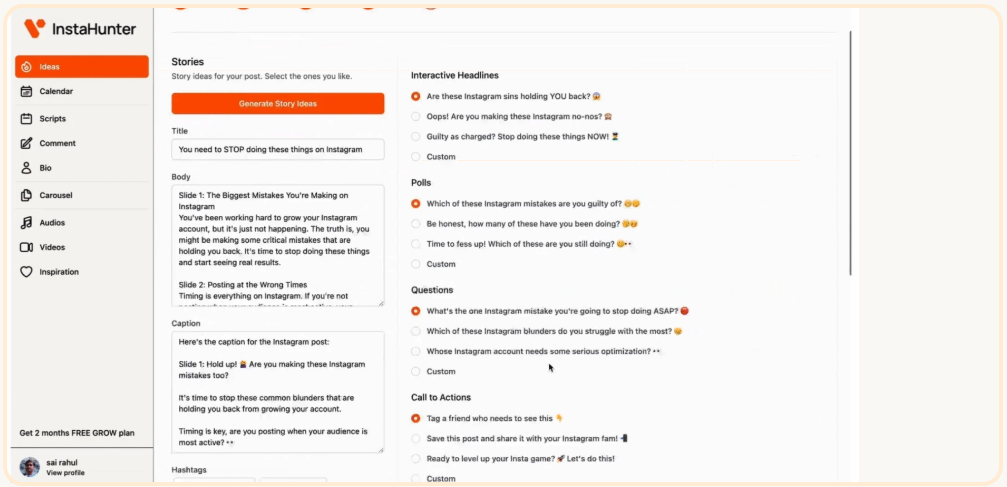 IG Hunter is an all-encompassing tool designed to accelerate growth on Instagram, focusing on helping users expand their audience quickly. Our goal is to streamline the creation of impactful content, while also allowing you to grow a follower base that aligns with your expertise, earn revenue, and attract fresh opportunities. By inputting your specific niche, target demographic, and goals, our AI generates tailored reel ideas and scripts to kickstart your content creation journey. We offer a free 14-day trial so you can explore all our features without any financial commitment. Our pricing model is straightforward and transparent; the subscription fee provides complete access to IG Hunter's essential features, continuous updates, and standard customer support. There are no hidden fees associated with setup or maintenance. Additionally, our refund policy emphasizes your satisfaction; if IG Hunter does not meet your expectations within the first 30 days of your subscription, you can receive a full refund. This assurance showcases our belief in the quality and usefulness we provide to our users, as we strive to support their growth on the platform. With IG Hunter, you are empowered to reach your social media goals effectively and efficiently.