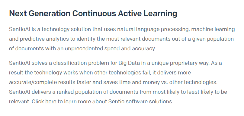 SentioAI stands out as a cutting-edge technological solution that harnesses the power of natural language processing, machine learning, and predictive analytics to quickly and effectively identify the most relevant documents from a large pool. By tackling the classification issues associated with Big Data through its distinctive proprietary techniques, SentioAI surpasses competing technologies, delivering faster and more accurate outcomes while remaining budget-friendly. The platform organizes documents based on their relevance, enabling users to examine and label a limited portion of the dataset. This labeled information is then utilized to train SentioAI's prediction engine, which consistently improves its accuracy with the introduction of each new document. The system is designed to intelligently determine when training is complete, after which it applies its models across the entire dataset, yielding thorough results. As a result, not only does SentioAI expedite the document retrieval process, but it also guarantees that users receive the most dependable information in a timely manner, enhancing overall productivity. With its innovative approach, SentioAI is positioned to revolutionize the way organizations handle information retrieval.