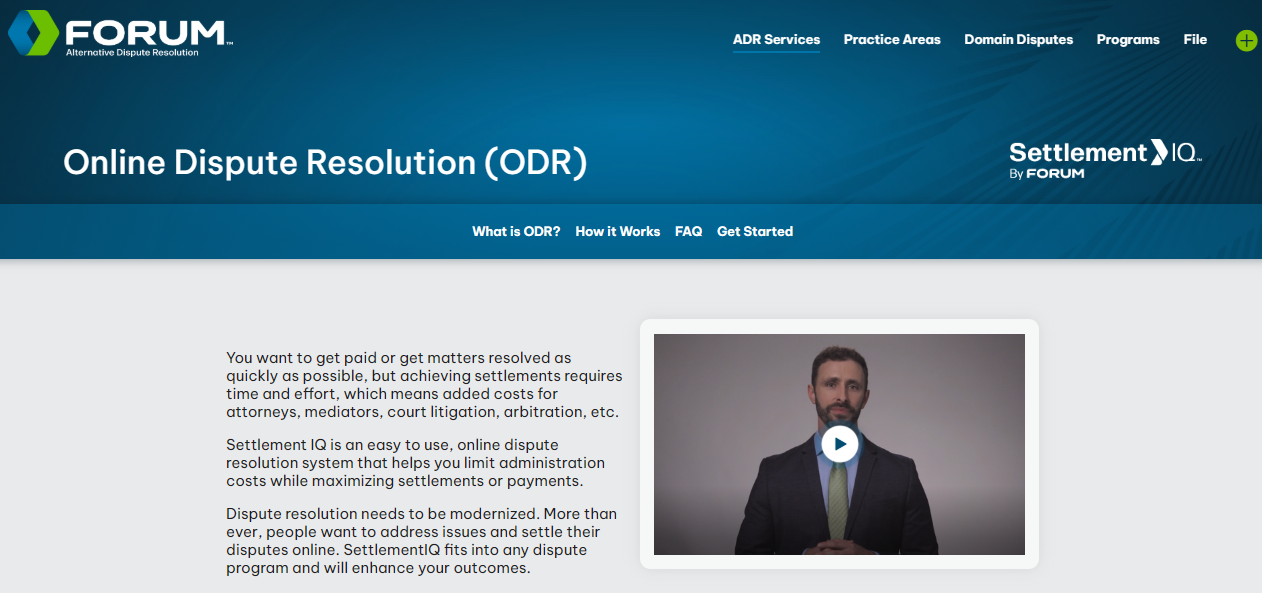 FORUM is recognized as a leading provider of Alternative Dispute Resolution (ADR) services, specializing in arbitration, mediation, and online dispute resolution (ODR) through its cutting-edge platform, SettlementIQ. This fully online system is designed to improve the dispute resolution process by reducing administrative costs and maximizing the likelihood of settlements or payments. SettlementIQ features a variety of dispute resolution strategies, including blind bidding, direct online negotiations, and neutral assistance, all conducted within a secure digital environment. The platform facilitates smooth collaboration with arbitrators, mediators, or experts, customized to address the specific requirements of each individual dispute. Its benefits are especially notable in industries such as insurance, debt recovery, business-to-business dealings, and general ADR, providing a more efficient and cost-effective alternative to traditional dispute resolution approaches. Additionally, SettlementIQ's flexibility allows it to accommodate a broad spectrum of disputes, establishing it as a valuable resource in the realm of conflict resolution, which can lead to faster resolutions and improved satisfaction for all parties involved.