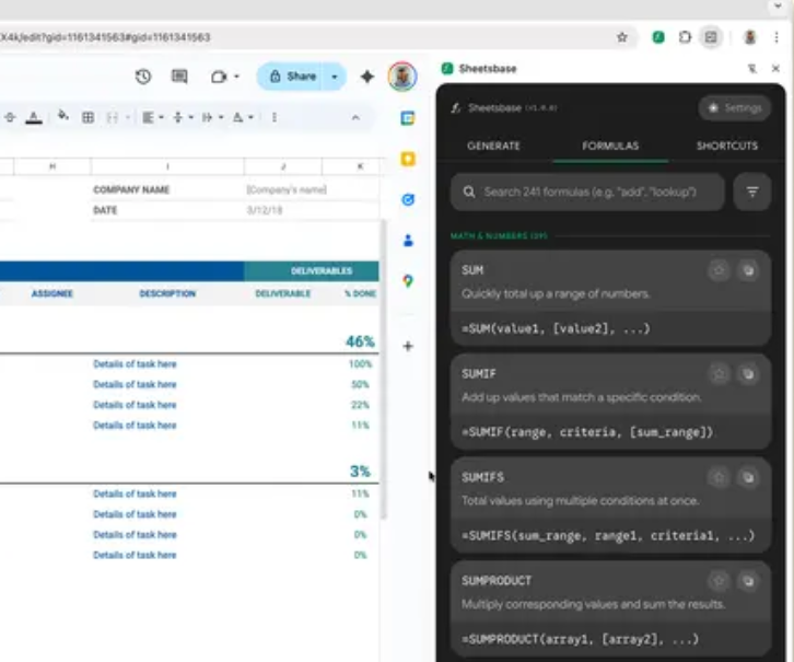 Sheetsbase is a groundbreaking Chrome extension that leverages AI technology to improve the Google Sheets user experience by allowing users to create and understand formulas directly within their browser, eliminating the hassle of switching between tabs and seamlessly integrating smart support alongside their active spreadsheets. By translating simple English instructions into effective Google Sheets formulas, this tool provides clear explanations of existing formulas, ensuring that users no longer need to hunt for help elsewhere. Moreover, it boasts a comprehensive directory with over 240 formulas and more than 130 keyboard shortcuts, all designed to boost productivity. Users can effortlessly save and copy their favorite formulas, gain quick access to shortcuts, and reduce the time spent seeking solutions outside their current tasks. As a result, novices can grasp complex functions more easily, while experienced users can perform formula-related tasks with increased efficiency. Additionally, Sheetsbase not only simplifies the spreadsheet workflow but also empowers all users to enhance their proficiency with Google Sheets in their everyday activities, fostering a more intuitive and streamlined approach to data management.
