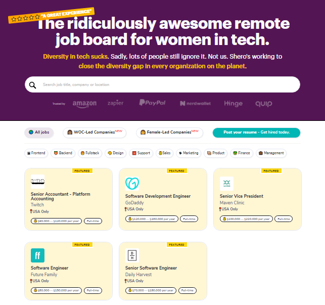 Shero is a remarkable remote job platform tailored for women working in the technology sector. While the lack of diversity in tech is a pressing issue that often gets overlooked, Shero actively confronts this challenge head-on. Our mission is to close the diversity gap that persists in organizations across the globe. By subscribing, you can receive weekly updates about job vacancies from companies that recognize and appreciate your unique skills. This ensures you are always in the loop regarding remote job opportunities that fit your career goals! Even if you have a basic understanding of what Shero is about, its foundational purpose is much more profound than just its features. The driving force behind Shero's establishment was to empower women in technology to land roles at top-tier firms worldwide that emphasize diversity, inclusion, and equity. By promoting remote work, Shero gives women in tech the flexibility to manage their careers and personal lives from anywhere, while also helping organizations discover outstanding female tech talent without geographical limitations. Many prominent companies, including both emerging startups and established Fortune 500 corporations like Amazon, Paypal, SeatGeek, Hinge, Yardi, and GoDaddy, rely on Shero for their remote hiring needs. Ultimately, Shero strives to cultivate an inclusive atmosphere that not only promotes the progression of women in technology but also drives success for organizations as a whole, thereby benefiting everyone involved in the tech industry. In doing so, it contributes to a more equitable workplace that values diversity at every level.