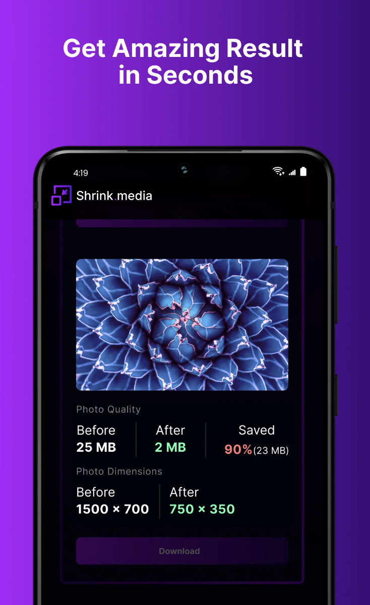 Enhance your images by skillfully compressing and resizing them, and you can easily obtain the optimized versions for free. The cutting-edge Shrink.media mobile application enables you to intelligently reduce your image file sizes without any cost. A visual comparison demonstrates the contrast between the original PNG image on the left and the skillfully compressed version on the right, highlighting the effectiveness of Shrink.media. By minimizing file sizes, you can achieve faster loading times for web pages, which greatly improves overall website performance. Functioning as a rapid image compression tool, Shrink.media quickly reduces image sizes within mere seconds. It does this by cleverly compressing images and modifying their dimensions, making the process both user-friendly and efficient. The tool accommodates a maximum output resolution of 5000 x 5000 pixels and allows for a file size limit of 25 MB, guaranteeing high-quality outcomes. Furthermore, users can enjoy the simplicity of the app while achieving impressive results in no time.