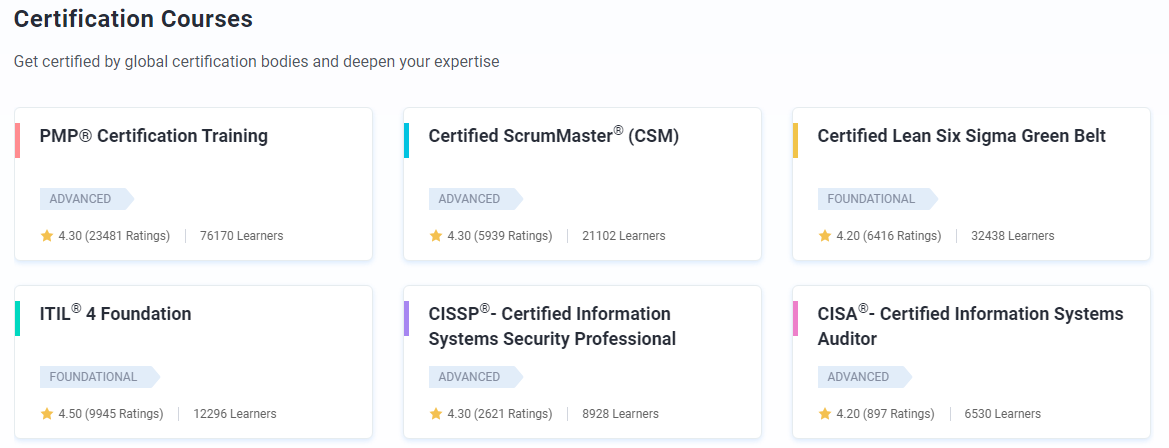 As the foremost online bootcamp in the world, we provide vital digital skills education that enables individuals to thrive in the fast-changing digital marketplace. Our extensive online courses encompass key domains such as Cyber Security, Cloud Computing, Project Management, Digital Marketing, and Data Science, among others. We specifically emphasize areas where technological advancements and best practices are rapidly progressing, leading to a significant need for skilled professionals. Our programs are thoughtfully crafted and consistently refreshed by a network of over 2,000 respected experts from both industry and academia, offering a variety of choices ranging from single courses to comprehensive certification tracks. By partnering with renowned universities, we enhance our educational offerings, empowering millions of individuals with the practical skills needed to advance their careers while also assisting countless organizations with their corporate training and employee development efforts. Our practical and interactive teaching methodologies have resulted in an impressive 85 percent of our learners experiencing job promotions or obtaining new job positions, highlighting the success of our training initiatives. Furthermore, we are dedicated to cultivating a community of lifelong learners who are prepared to meet the challenges presented by the digital world, ensuring they remain relevant and competitive in their respective fields. This commitment to ongoing education underscores our mission to be a catalyst for professional growth and transformation.