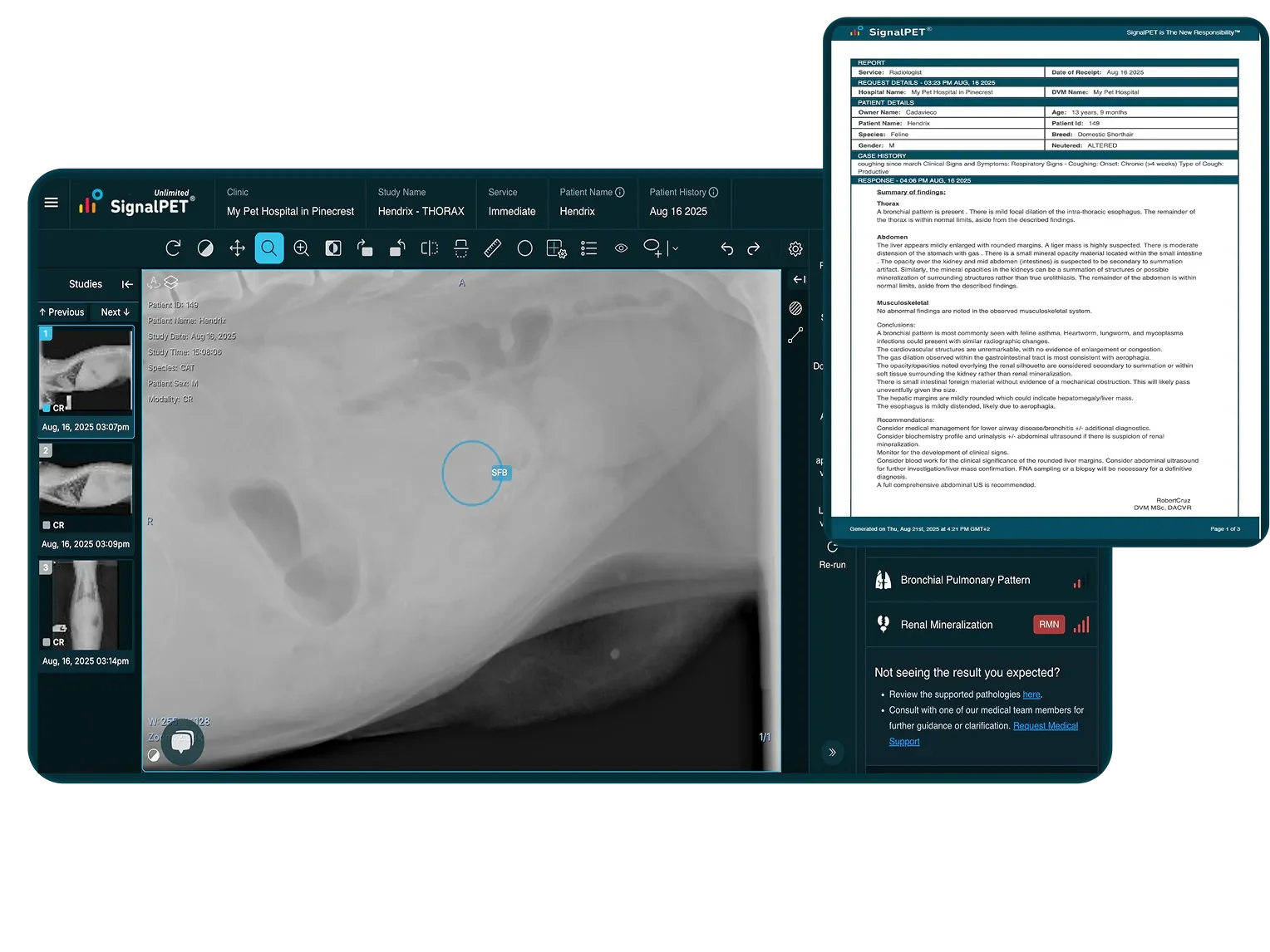 SignalPET 360° is a state-of-the-art veterinary radiology system that integrates advanced vision-based artificial intelligence, context-aware language processing, and PACS technology, all while ensuring continuous access to board-certified radiologists for swift and actionable imaging insights across various modalities, such as X-rays. This comprehensive platform meticulously assesses each case and image, acting as an extra layer of evaluation to provide rapid AI-generated insights within minutes, emphasizing critical pathologies in thoracic, abdominal, musculoskeletal, soft tissue, and dental areas, and it can produce structured preliminary evaluations in under five minutes. Its Complete Report feature utilizes sophisticated machine vision and extensive language models to create detailed findings, conclusions, and clinical recommendations that closely mirror those of a traditional radiologist's report, usually delivering results within a 30-minute window, thereby assisting clinicians in understanding the findings, their significance, and possible next steps. Furthermore, this groundbreaking platform boosts the efficiency and precision of veterinary diagnostics, ultimately leading to better patient care and outcomes, while simultaneously enabling veterinarians to make more informed decisions based on comprehensive insights. Such advancements not only streamline the diagnostic process but also foster a collaborative approach to animal health management.