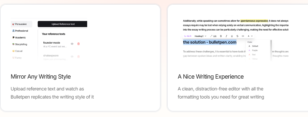 Bulletpen is a cutting-edge AI application that transforms your spoken ideas and reflections into polished written material. By expressing your thoughts in a natural manner, you can witness how Bulletpen adeptly captures and elevates your concepts into cohesive narratives. The platform is particularly adept at generating text with your preferred tone, enabling you to choose the perfect voice for different content types, from scholarly articles to engaging stories. Additionally, Bulletpen features sophisticated AI editing options that allow for meticulous refinement of your drafts and can mimic various writing styles by permitting users to upload sample texts. Its user-friendly interface encourages a focused and enjoyable writing experience, further enhanced by formatting tools designed to boost your efficiency. Whether you are just starting out or aiming to broaden your writing skills, we offer a variety of pricing plans crafted to meet your specific requirements. Explore our range of options to discover the plan that works best for you. Furthermore, you can access detailed responses to common inquiries about our SEO features, helping you to maximize the potential of this powerful platform. This positions Bulletpen as not just a writing assistant, but as a comprehensive resource for elevating your content creation process, making it an invaluable tool for writers at any level.