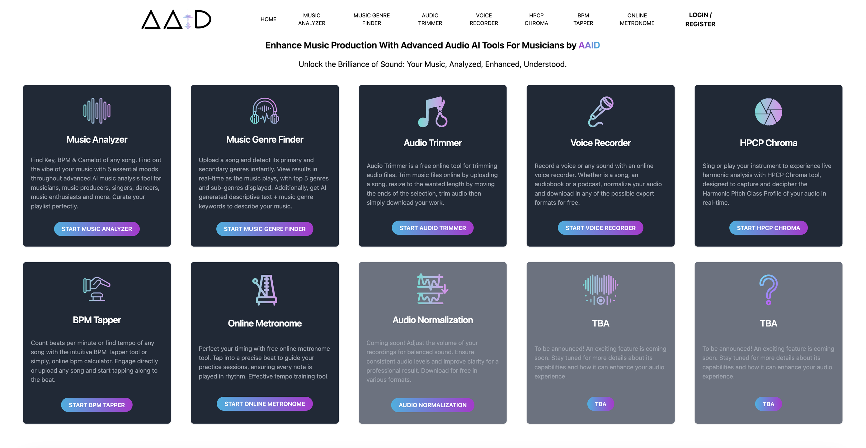 Audio AI Dynamics (AAID) offers a range of AI-driven web tools designed to assist musicians, sound enthusiasts, and producers alike. This comprehensive selection of features enhances the music production process, catering to both seasoned professionals and those just beginning their musical journey.
