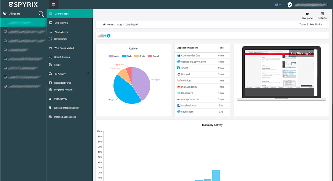 Spyrix Activity Monitoring serves as a robust remote control tool specifically designed for Mac computers. This innovative software facilitates remote oversight through a user-friendly online dashboard, enabling the tracking of up to 500 employees. It boasts an extensive array of functionalities, including keylogging, screen recording, and the ability to record both webcam and microphone activity, in addition to monitoring websites and social media applications.