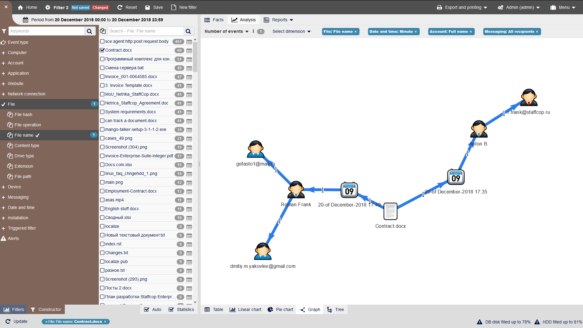 Employing automated and statistical evaluations, the system detects anomalies in user behavior, enabling the identification of potential insiders and untrustworthy employees.