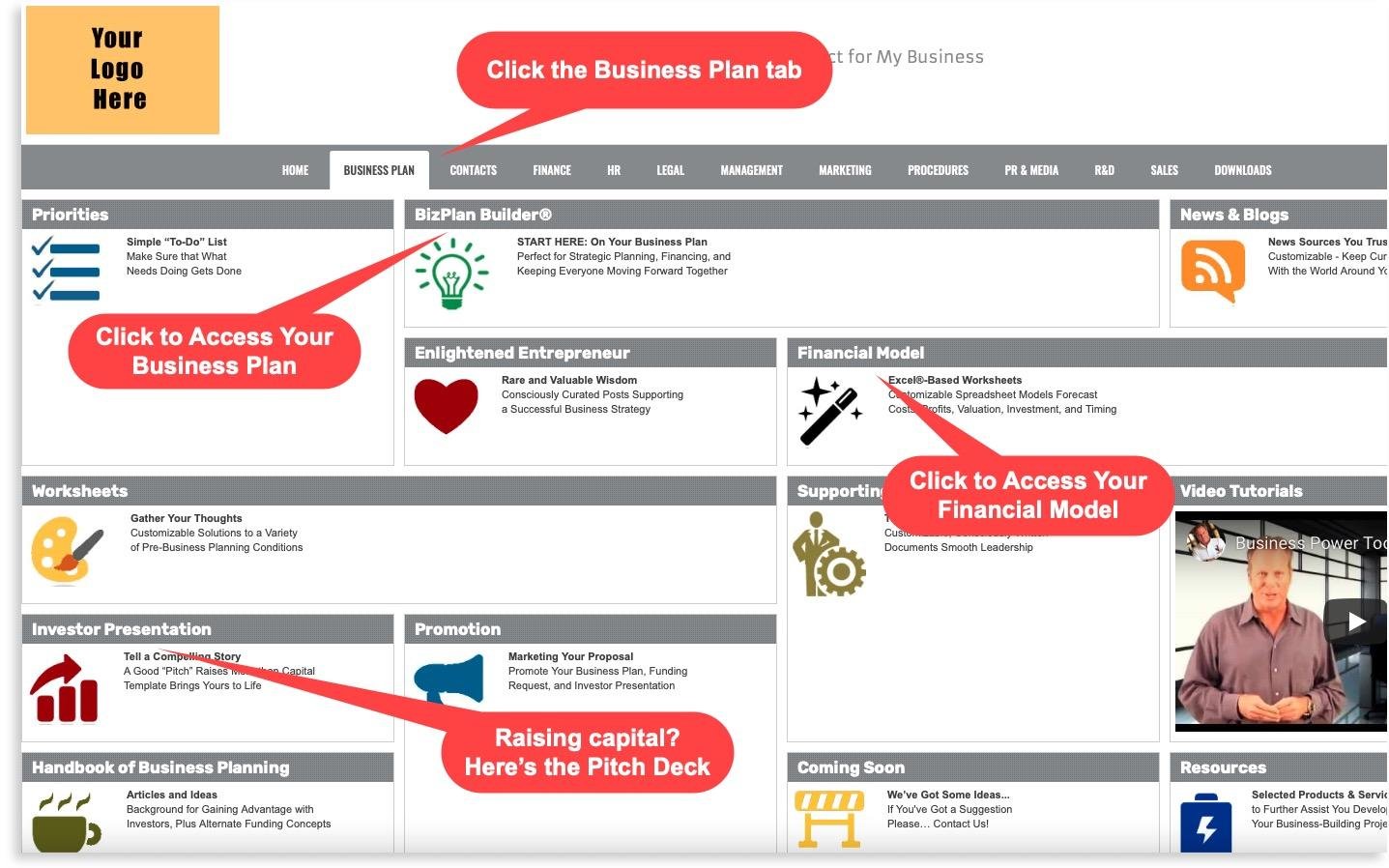 The system features adaptable, professionally written narratives, financial models, and supporting documents, accompanied by video tutorials for user guidance.