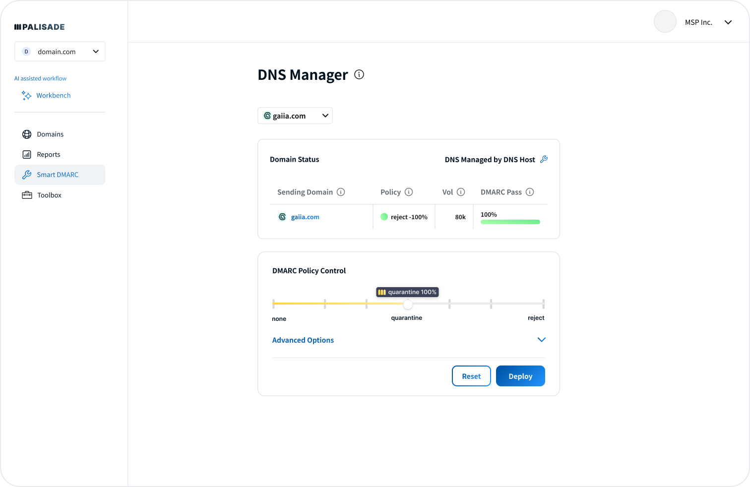 Palisade stands out as the sole DMARC automation tool tailored specifically for managed service providers (MSPs).