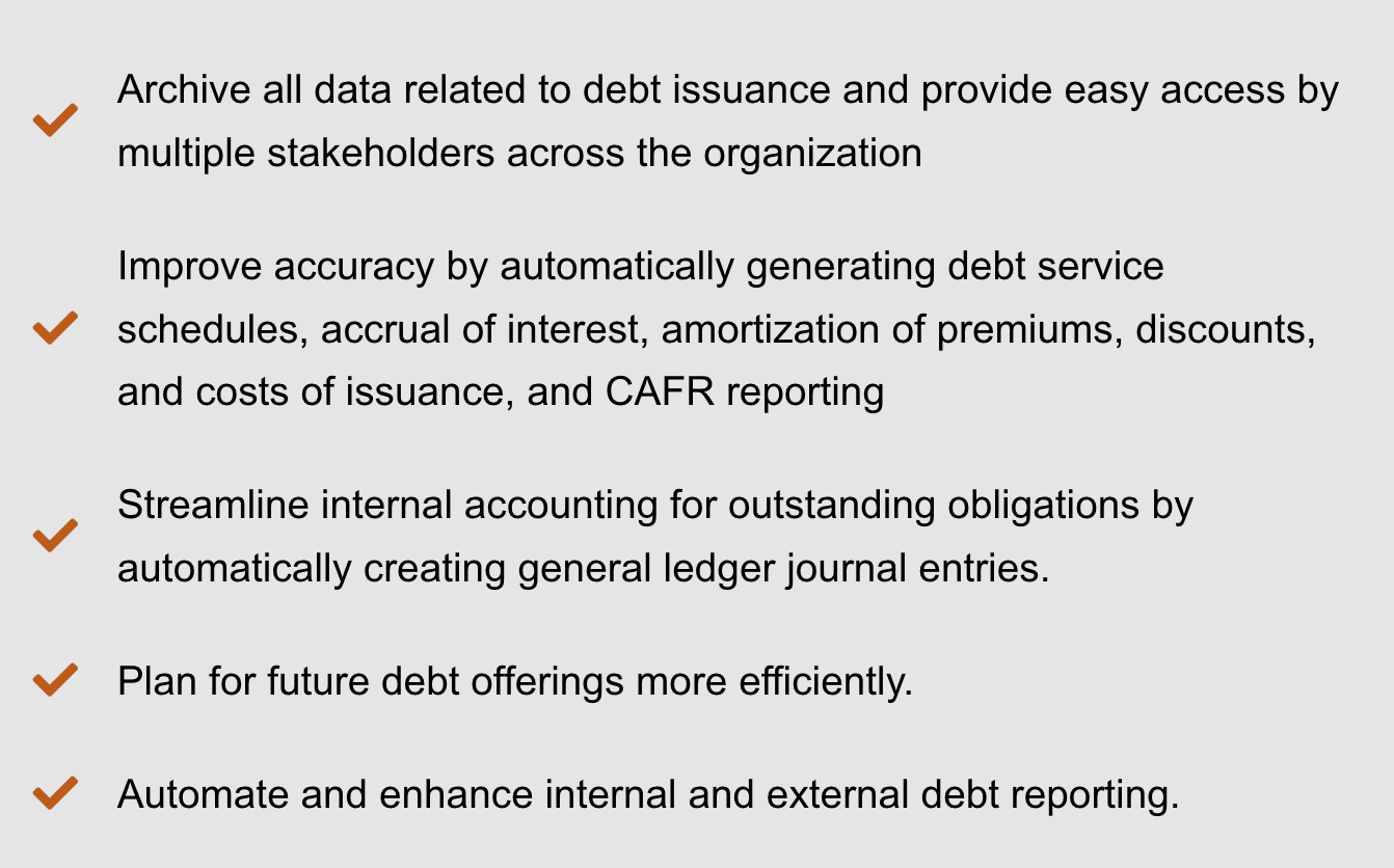Users of the debt management platform are provided with instant access to an extensive range of data relating to both past and present debt issuances, which includes organized debt service schedules at the CUSIP level, detailed sources and uses of funds, call provisions, redemption options, and the distribution of debt service across different funds, as well as critical information like financing participants and historical ratings. The platform delivers a coherent overview of debt responsibilities that includes terms, call provisions, and redemption schedules. It carefully tracks outstanding debts at various tiers—project, division, and enterprise levels—and generates comprehensive reports regarding remaining principal, interest, and payment responsibilities for all securities associated with a given bond issue. Moreover, it seamlessly integrates scheduled debt payments with our cash flow module, facilitating effective liquidity management and ensuring users maintain an accurate understanding of their financial obligations. This integrated approach not only fosters greater transparency but also equips users with the necessary insights to make well-informed choices about their debt portfolios. Ultimately, the platform serves as a vital tool for users aiming to navigate the complexities of debt management with confidence and clarity.