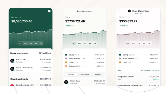 Savvy integrates cutting-edge technology with deep financial expertise to grant you greater independence and peace of mind. We are crafting technology-driven wealth management solutions that deliver a holistic view of your complete financial landscape. Our expert investment team conducts regular portfolio evaluations, assisting your advisory team in reaching your financial goals. By streamlining processes from onboarding to performance analysis, our technology guarantees that your advisor can focus more quality time on your needs. Savvy is made up of exceptional and seasoned financial advisors situated across the United States. Enhance every aspect of your financial journey with client services tailored for a seamless and efficient experience. Besides retirement and estate planning, Savvy offers an extensive range of financial services, including tax strategy, alternative investments, direct indexing, and net worth tracking, all while enabling you to access your accounts with integrated advice and reporting. Our mission is to equip you with the necessary tools and resources to make well-informed financial decisions. Furthermore, we strive to foster a supportive environment that encourages financial literacy and empowerment for all our clients.