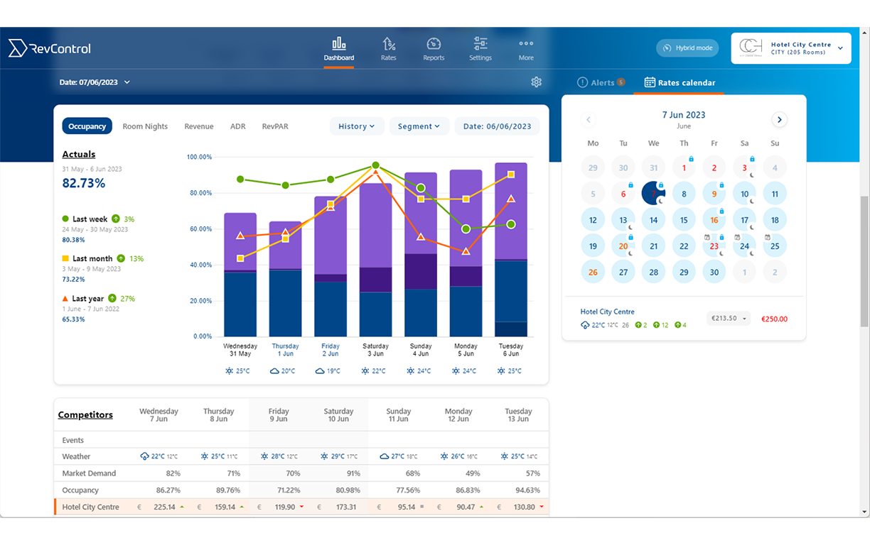 With BOB as your indispensable partner in revenue management, we establish a seamless link with your Property Management System (PMS), allowing you to effortlessly view and oversee your data through RevControl. Quickly assess your data against past performance and planned budgets, and receive alerts for any unexpected surges in demand, ensuring you capitalize on every chance to elevate your rates. RevControl simplifies the process of comparing your ongoing performance to historical data, all in an easily digestible format. Additionally, our system transmits rates directly to your PMS or Channel Manager for further distribution. You can choose to manually approve our rate suggestions or opt for automatic or hybrid modes—it's all in your hands! The flexibility and control offered by RevControl empower you to make informed decisions that drive your revenue growth.
