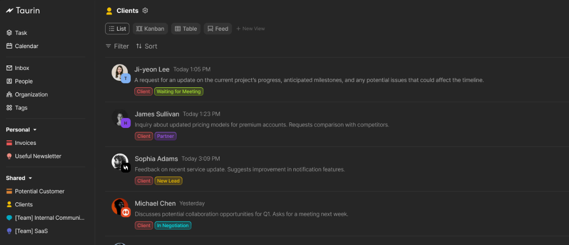 Discover the transformative benefits of auto-segmentation, intelligent filtering, AI-powered auto-completion, and a fully integrated CRM system, all conveniently housed on a single platform. Leave behind the monotonous tasks that drain your valuable time and focus on what really matters. Effortlessly oversee your contacts using customizable properties tailored to meet diverse requirements. No matter if you're engaged in sales, marketing, or recruitment, you can adapt quickly and efficiently to any scenario. Taurin changes the game of email management by organizing your inbox, providing succinct summaries, and improving your contact database. With its self-sufficient features, Taurin enables you to spend more time nurturing meaningful connections rather than getting bogged down in endless email exchanges. As email continues to be a vital communication tool, it is essential to upgrade our methods of managing it. In light of the growth of remote work and the increase in digital communications, cutting-edge solutions like Taurin are critical for effectively overseeing our exchanges. This is not just another email application; it acts as your personal email intelligence assistant. With advanced AI that arranges your emails accurately, combined with extensive contact insights, you can rest assured that you will stay fully informed. Additionally, benefit from a rapid AI writing assistant that offers features like auto-summarization and auto-completion, paired with a built-in CRM to streamline all your professional interactions. Embrace the evolution of email management with Taurin, and elevate your communication experience to new heights today. It’s time to take control of your inbox and transform the way you connect with others.