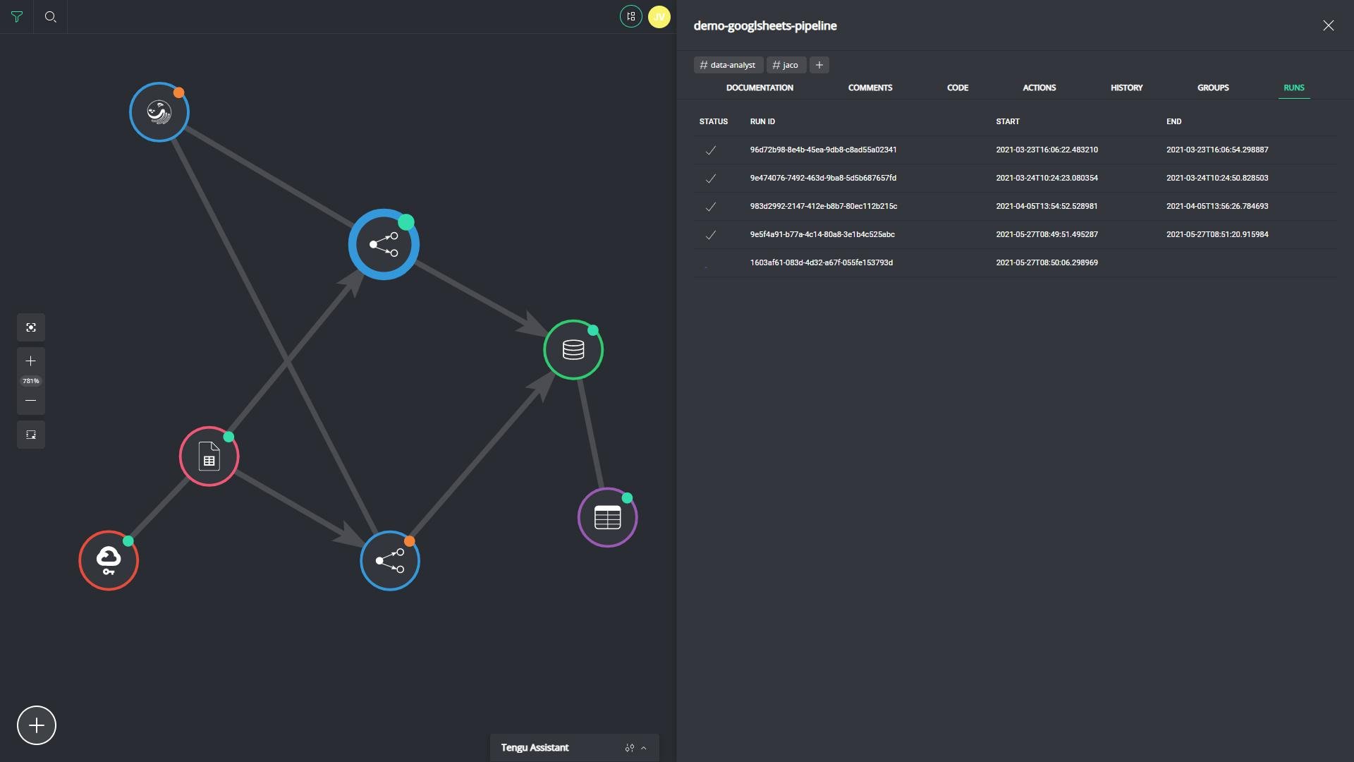 With its innovative graph view, TENGU offers full visibility and control over your data environment, making monitoring straightforward and intuitive. By consolidating all essential tools within a single workspace, it streamlines workflows.
