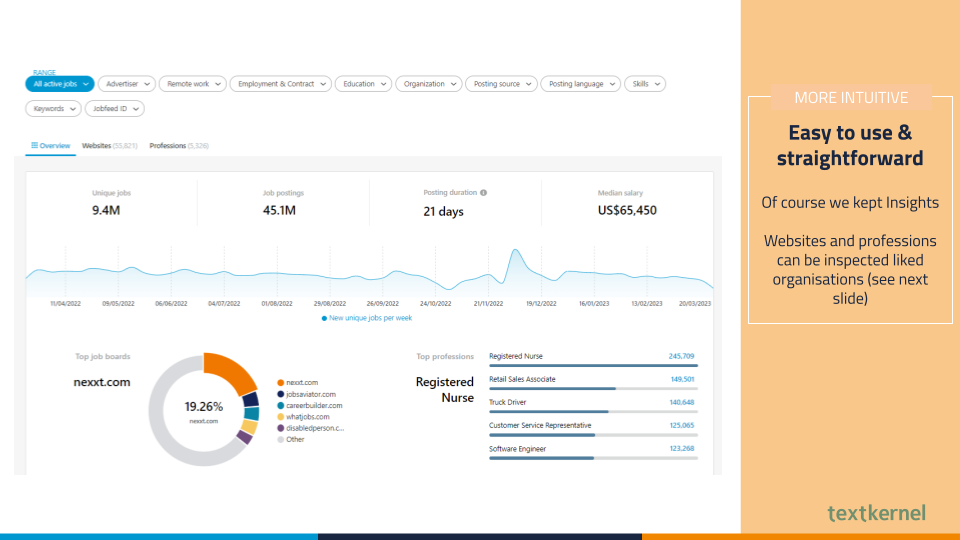 In the fiercely competitive job market of today, leveraging advanced data analytics tools can provide a significant advantage. Textkernel's Labor Market Insights offers access to an unparalleled job database that comprises over 3 billion job postings, both current and historical, sourced from more than 33 million websites. By enhancing and structuring organizational data, we can effectively analyze talent information in relation to market needs.