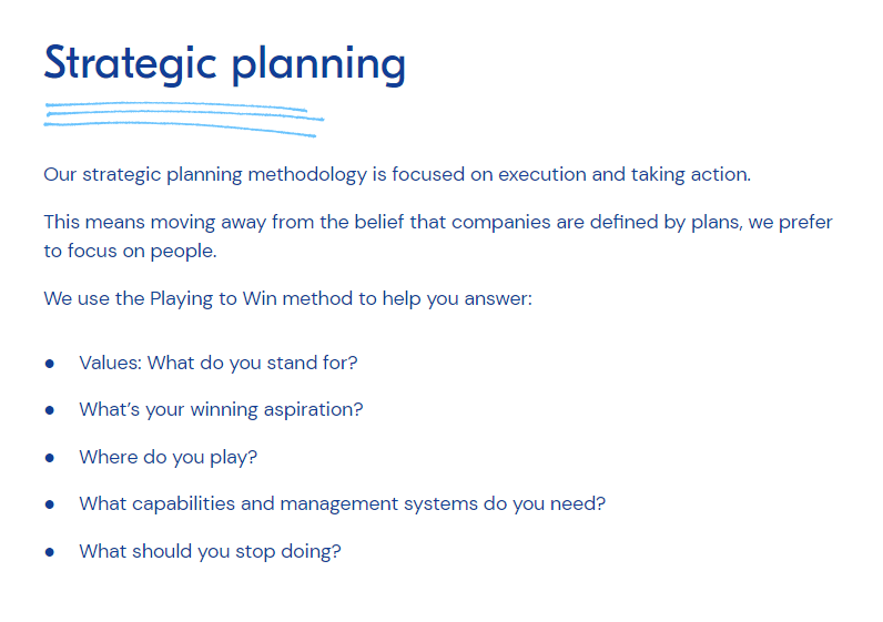 Our method for strategic planning emphasizes the importance of execution and proactive strategies, moving away from the idea that organizations are merely products of their plans, and instead highlighting the crucial role of their people. This engagement in our strategic planning process enables leadership teams to achieve greater cohesion while creating a tangible action plan. We implement an agile framework, which includes an annual offsite retreat designed to craft a bespoke strategy tailored specifically for your organization. The result of this collaborative effort is a fluid plan that adapts to the evolving demands of your business. Furthermore, our clients gain access to a planning platform that supports executives in monitoring their strategies and adjusting them according to real performance indicators. We provide strategic insights that accurately reflect the complexities of corporate growth, ensuring that our recommendations are relevant and actionable in today’s rapidly changing landscape. This holistic approach not only equips organizations to effectively confront challenges but also cultivates an environment of ongoing improvement and innovation. By fostering such a culture, we help businesses stay ahead in an increasingly competitive market.