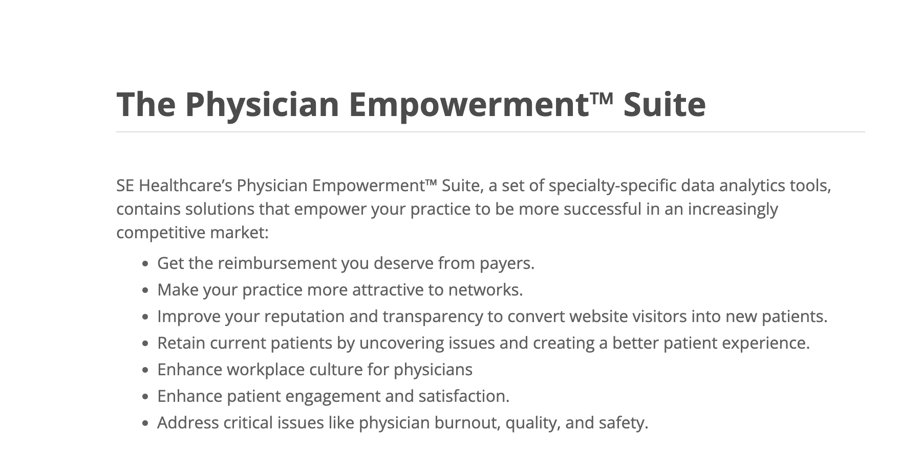 SE Healthcare's Physician Empowermentâ„¢ Suite encompasses a variety of advanced data analytics tools aimed at enhancing the success of your practice within a competitive landscape. By ensuring that you receive the insurance reimbursements you deserve, you can also increase your practice's attractiveness to healthcare networks. Elevating your reputation and fostering transparency allows you to convert website visitors into actual patients effectively. Furthermore, it's crucial to retain your current patients by pinpointing challenges and improving their overall experience. Cultivating a positive workplace atmosphere for physicians not only enhances patient engagement but also raises satisfaction levels. Addressing critical issues such as physician burnout, quality of care, and safety is essential. The suite offers insights into often neglected problem areas, leading to notable improvements in patient experience, engagement, and the overall performance of your practice, thus positioning your organization at the forefront of healthcare excellence. By leveraging these tools, you can create a more resilient and thriving practice that navigates the complexities of today's healthcare environment with confidence.