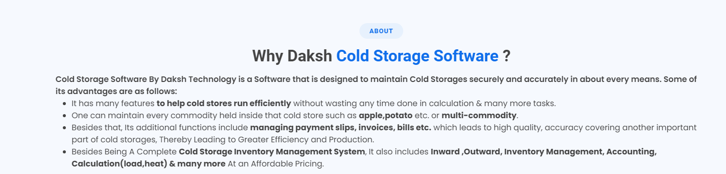 Our Cold Storage Software presents an all-encompassing solution for the effective management of cold storage facilities, integrating various business components like administration and accounting processes. Crafted for simplicity and swiftness, this software enables individuals with limited computer expertise to use it with ease. Beyond its intuitive design, it includes features for managing payment slips, invoices, and billing, thereby improving the quality and precision of cold storage operations, which contributes to enhanced efficiency and productivity. Additionally, this software functions not just as a comprehensive inventory management tool but also tackles inward and outward logistics, inventory oversight, accounting, and calculations related to load and thermal conditions, all at competitive rates. Daksh Technology is dedicated to delivering tailored solutions and excels in turnkey projects, having the state-of-the-art capabilities to create personalized cold storage software that meets your unique requirements. Our emphasis on innovation and customer satisfaction drives us to transform cold storage management, ensuring it meets the diverse needs of enterprises, regardless of their scale. By prioritizing our clients’ specific challenges, we aim to foster a new era of efficiency and effectiveness in the cold storage industry.