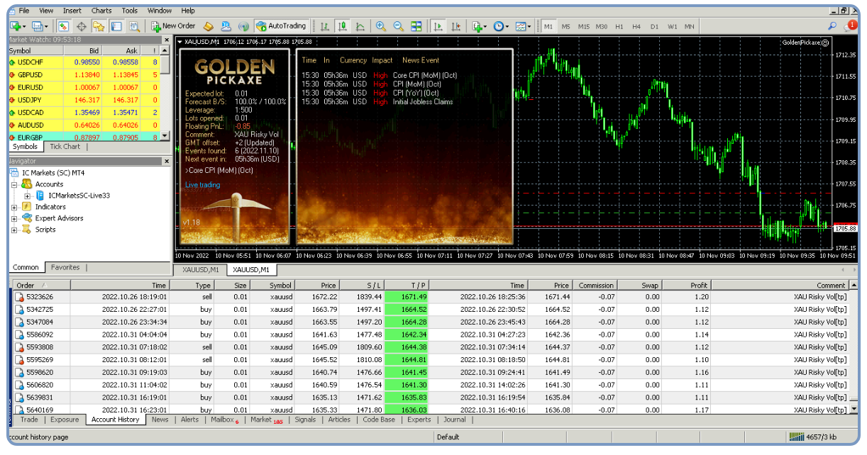 Golden Pickaxe is an innovative Forex robot designed for mean reversion grid trading, specifically targeting the Gold Market with the aid of machine learning technology to execute highly profitable trades. You can verify its performance through Valeriia Mishchenko's MyFxBook or her profile on the MQL5 marketplace. The expert advisor (EA) includes five distinct set files, representing various trading strategies tailored for gold, allowing users to select the default option called XAU Vol Balanced Vol or pick a different strategy that aligns with their trading style.