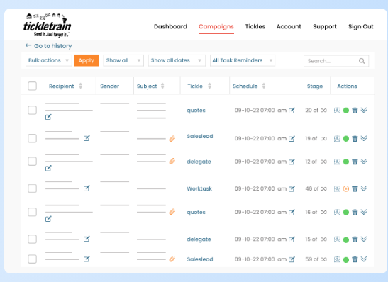 Bid farewell to the burdensome task of juggling your to-do list! TickleTrain allows you to transfer your tasks from your mind into a well-organized framework, bringing you a sense of calm. Effortlessly turn your emails into actionable tasks while you stay within your inbox, creating a seamless workflow. Enhance collaboration with your team by working together on projects, ensuring that no task is overlooked since TickleTrain keeps everything in check for you. You'll also eliminate the fear of missing out on following up with potential leads; TickleTrain takes care of your follow-ups with tailored, pre-written messages and enables you to set up drip email sequences in mere moments, all while portraying a polished image with our built-in templates. If you haven't received a reply, it automatically prompts follow-ups on your emails, instilling confidence in every message you dispatch. With just one click, you can convert any email into a task reminder, giving you the ability to schedule drip emails to any recipient, customized with unique content according to your preferences. TickleTrain not only transforms your task and communication management but also saves you valuable time, allowing you to focus on what truly matters and boosting your overall productivity. Embrace the efficiency and clarity that TickleTrain brings to your daily routine.