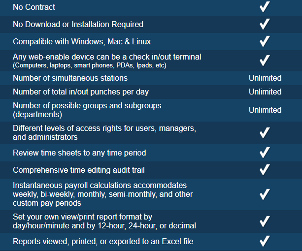 Buddy PunchOur cloud-based time tracking system simplifies payroll reporting by automatically filling in necessary details. Employees have the flexibility to clock in from various devices, including mobile phones and desktops, ensuring a convenient experience. The process of logging work hours is straightforward for staff, and supervisors can effortlessly access and export time data. Additionally, employees can utilize their web browsers or dedicated apps for iOS, Android, and Google to check in. The platform allows management to monitor who is currently on the clock, track their GPS locations, and set restrictions on where employees can log their hours. We provide easy Excel data exports and seamless integration with popular payroll software such as QuickBooks, ADP, Paychex, and SurePayroll. Enhanced functionalities are included in our time clock solution, featuring PTO Accrual Tracking, Punch Rounding, Job Codes, QR code scanning, Automatic Breaks, and Single Sign-On (SSO) capabilities, making it an all-in-one solution for workforce management. With these comprehensive tools, businesses can streamline their payroll processes and enhance overall productivity.