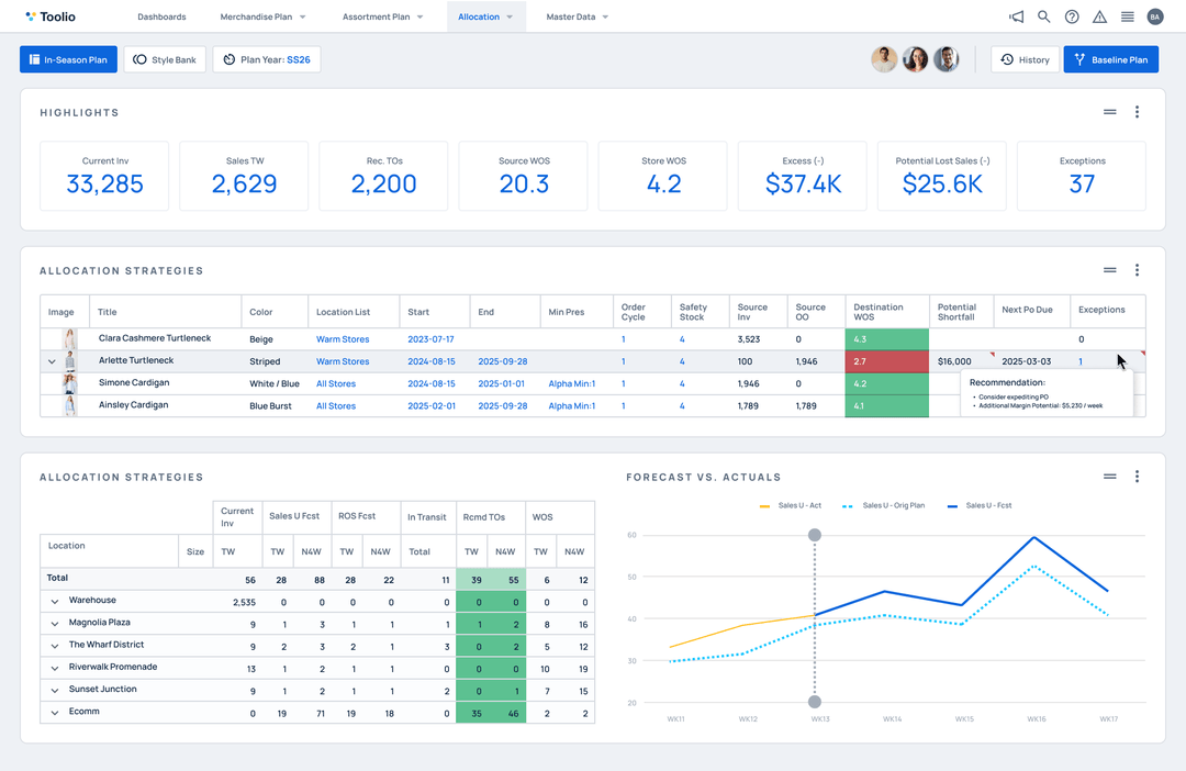 Toolio’s no-code flexibility allows retailers to customize metrics, hierarchies, and workflows while supporting top-down, bottom-up, and middle-out planning approaches. Merchandise, assortment, and allocation modules operate in sync, keeping goals, forecasts, and execution aligned in real time.