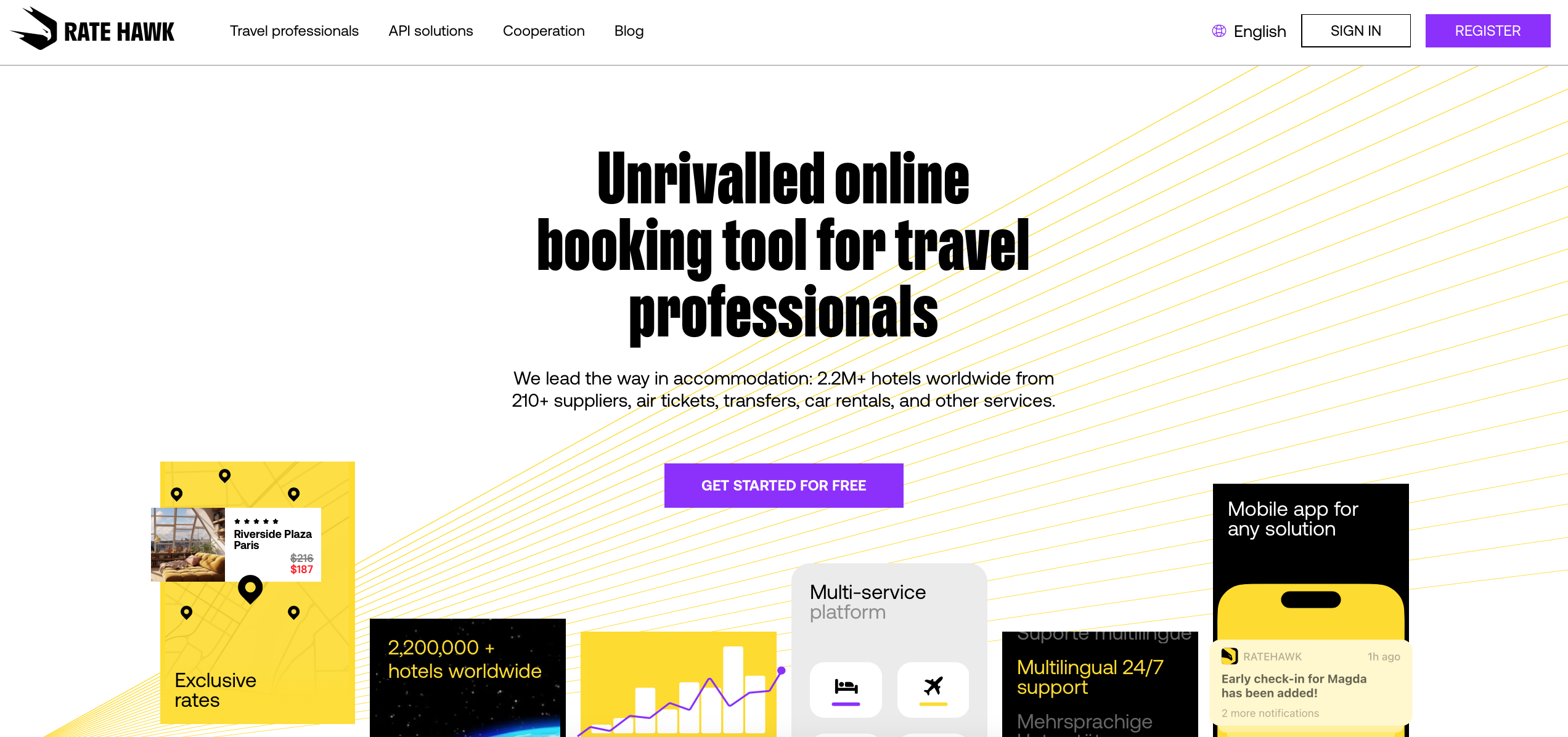 RateHawk provides a comprehensive booking platform tailored for travel agencies, facilitating multiproduct reservations. We meticulously explore the world to identify and select the most outstanding accommodation providers, ensuring quality and reliability. Our system aggregates rates and availability from over 280 global wholesalers, consolidators, OTAs, and DMCs, all integrated into a single, efficient booking tool. Additionally, we have direct contracts with more than 100,000 properties, enabling us to serve clients in over 220 source markets with access to more than 2,600,000 accommodations worldwide. By merging cutting-edge technologies with a wealth of industry expertise, RateHawk delivers an online booking backend that is remarkably user-friendly, relevant, and responsive, setting a new standard in travel technology. This commitment to innovation ensures that our clients can easily navigate and manage their bookings with confidence.