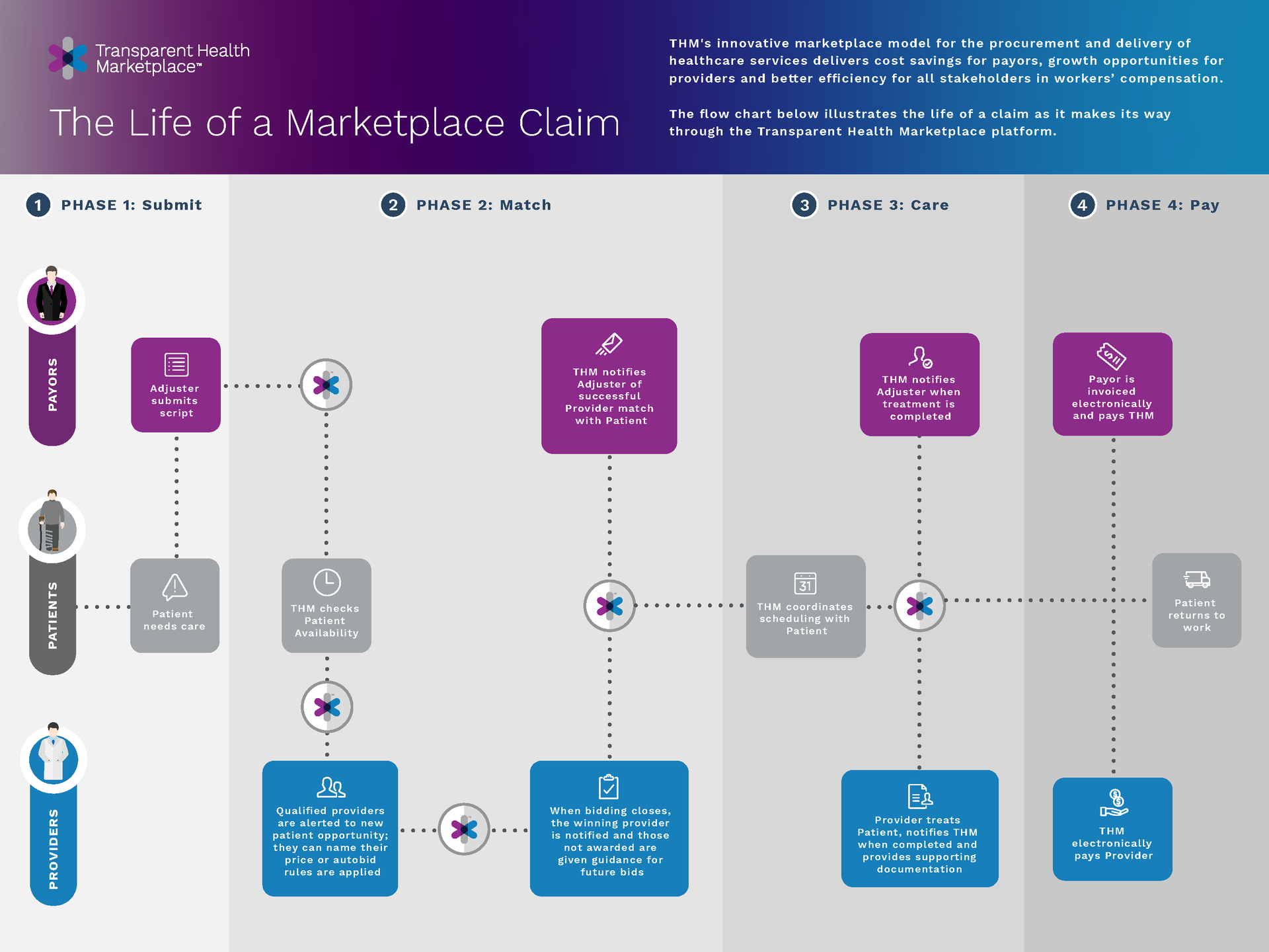 THM functions as an open and transparent hub that links healthcare service providers with carriers, third-party administrators, and employers, all of whom are essential in delivering prompt and affordable care to injured workers. By utilizing innovative marketplace technologies that have transformed industries like travel and finance, THM boosts efficiency and transparency within workers’ compensation healthcare. The platform streamlines cumbersome manual processes and eliminates expensive intermediaries, leading to substantial cost savings for carriers, TPAs, and employers who engage with THM’s offerings. With a platform-as-a-service model, THM empowers payors to create a vibrant marketplace filled with high-quality healthcare providers eager to earn their business. Furthermore, healthcare providers gain access to a significant new channel for receiving referrals from key industry payors, allowing them to strategically manage pricing, optimize their resources, and enhance revenue by filling more appointment slots. This mutually beneficial arrangement not only promotes a more competitive healthcare landscape but also ensures that all stakeholders can operate more effectively and efficiently. Consequently, the overall improvement in service delivery enhances the quality of care provided to injured workers.