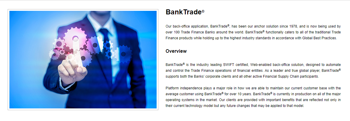 Since its launch in 1978, our back-office software, BankTrade®, has established itself as a foundational solution, now leveraged by over 100 Trade Finance Banks around the world. It proficiently meets all conventional Trade Finance needs while complying with the highest industry standards and Global Best Practices. As the premier SWIFT certified, web-enabled back-office solution, BankTrade® is designed to enhance and oversee the Trade Finance functions of financial institutions. Highlighting its leadership in the global arena, BankTrade® serves not just banks' corporate clients but also all stakeholders within the Financial Supply Chain. Our dedication to platform independence plays a crucial role in our client retention, with many relying on BankTrade® for more than ten years. At present, BankTrade® functions flawlessly across all predominant operating systems currently on the market. This versatility and enduring nature underscore the confidence and dependability that our clients have consistently placed in our solution throughout the years. Moreover, we continually strive to innovate and adapt, ensuring that BankTrade® remains at the forefront of industry advancements.