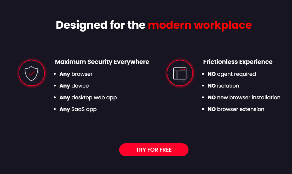 Central to the concept of hybrid work is browsing, which has become a focal point for cyber attackers seeking vulnerabilities. Red Access presents an innovative agentless browsing security platform aimed at safeguarding both in-office and remote devices without intrusive measures. This cutting-edge solution enables businesses to protect their employees' online activities across multiple browsers, web applications, devices, and cloud services, all while ensuring a seamless user experience and straightforward management that supports productivity. Moreover, it eliminates the need for installing browsers or extensions, thereby alleviating the burden of frequent updates that are necessary to address zero-day vulnerabilities. With its effortless compatibility across all web applications and browsers, Red Access is vital in defending against modern threats that target browsing, files, identities, and sensitive data. Consequently, organizations can concentrate on their primary objectives without the persistent concern of online security threats, fostering a more secure and efficient working environment. As the landscape of cyber threats evolves, solutions like Red Access become increasingly essential for maintaining robust digital safety.