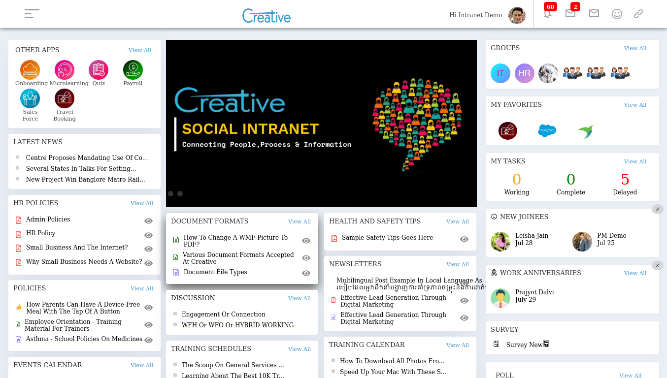 Creative Social Intranet provides robust intranet solutions designed to enhance the onboarding process and foster greater employee engagement. Our user-friendly, web-based social intranet platforms are hosted on secure, high-quality servers. Clients can opt for local or cloud-based servers, or benefit from a hybrid solution that combines the advantages of both systems.