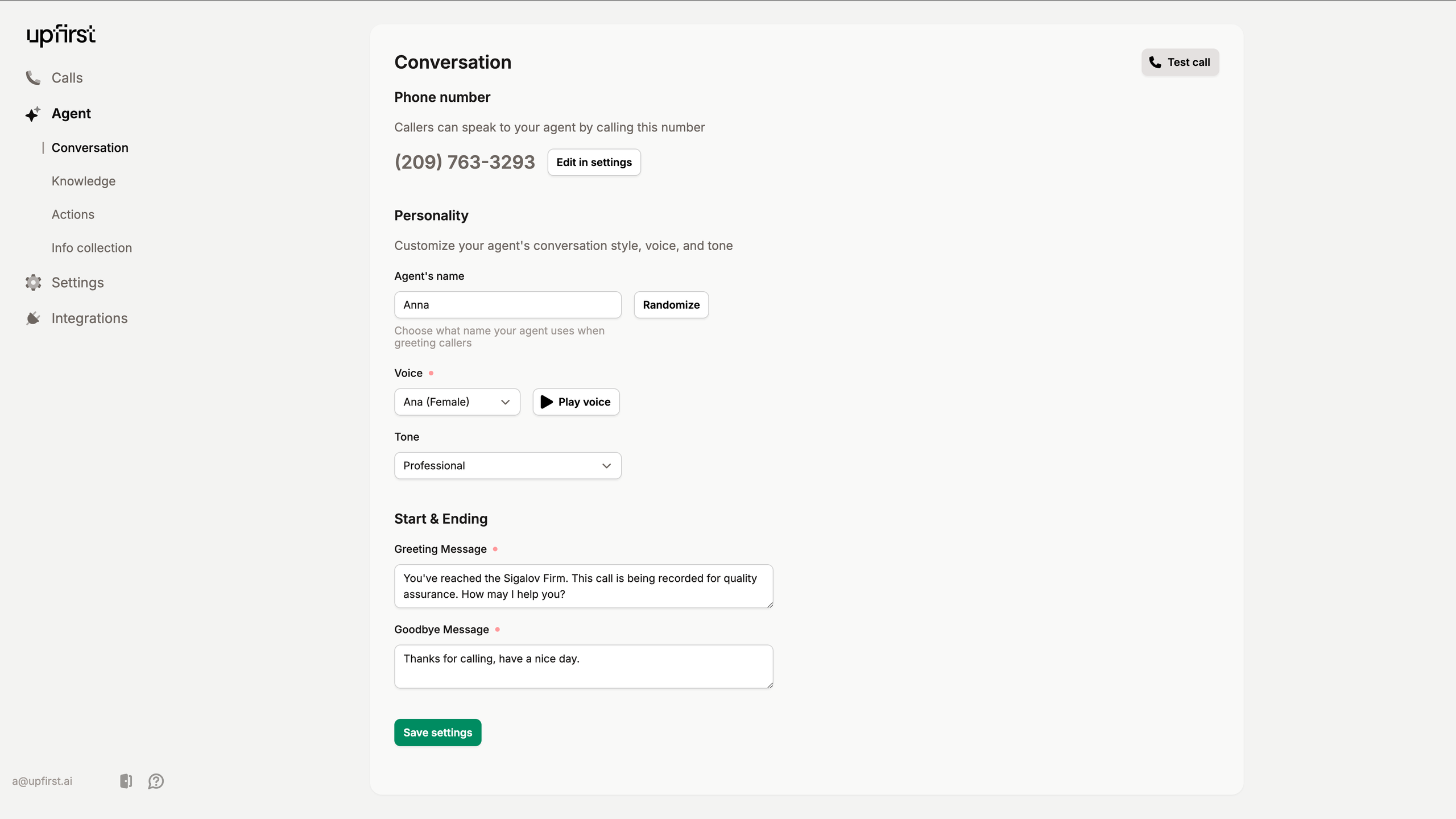 Additionally, you have the flexibility to personalize your Upfirst agent's voice, greeting, and instructions, allowing for a tailored experience that reflects your brand's identity. By leveraging Upfirst, you can ensure that your business maintains a professional presence even when you're not available.