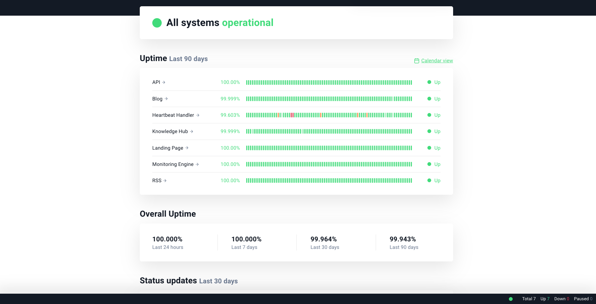 Experience the premier uptime monitoring solution that offers 50 monitors with 5-minute intervals at no cost. Setup takes mere seconds, ensuring you remain updated on your website's performance continuously.
