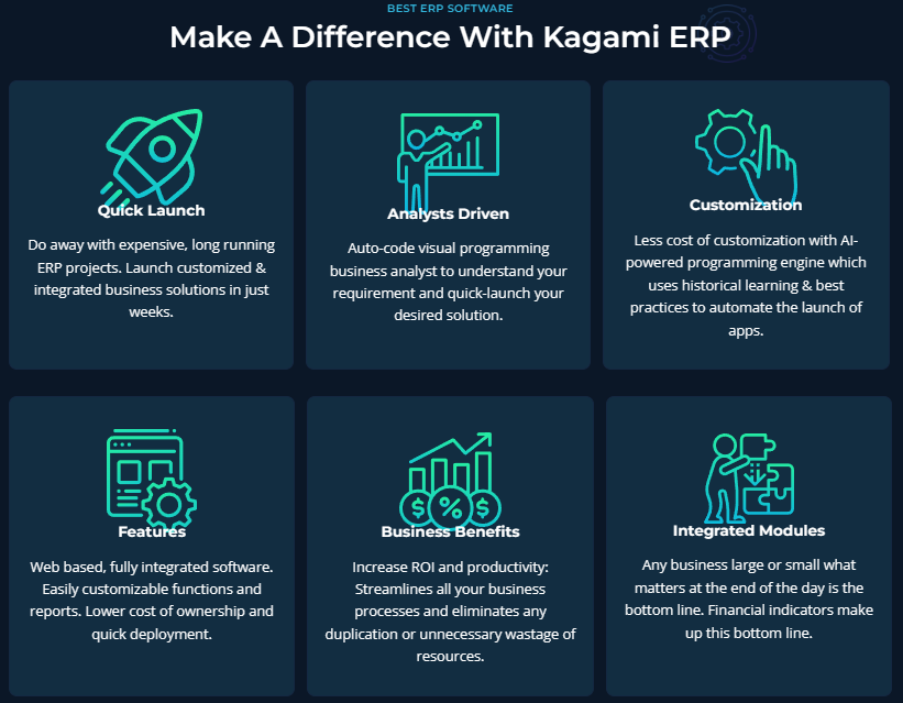 Kagami is a cutting-edge AI-powered tool that provides an outstanding ERP solution, streamlining the traditionally expensive and time-consuming ERP implementation process. It allows businesses to deploy customized and integrated solutions within weeks by utilizing auto-code visual programming, enabling business analysts to quickly understand requirements and hasten the rollout of desired systems. With its AI-driven programming engine, customization expenses are greatly minimized as it employs historical data and industry best practices to automate the application launch. This fully integrated web-based software simplifies the customization of functions and reports, ultimately leading to reduced ownership costs and expedited deployment. By fine-tuning all business operations, Kagami boosts ROI and productivity while eliminating redundancies and conserving resources. No matter the scale of an organization, the financial bottom line is crucial, and key performance indicators play a vital role in this assessment. Kagami distinguishes itself as the leading provider of ERP software solutions, equipped with a visual auto-code platform that emphasizes efficiency and effectiveness. Furthermore, its intuitive interface promotes quick adaptation among teams, encouraging enhanced collaboration and innovation among employees, which can lead to more creative solutions and improved overall performance.